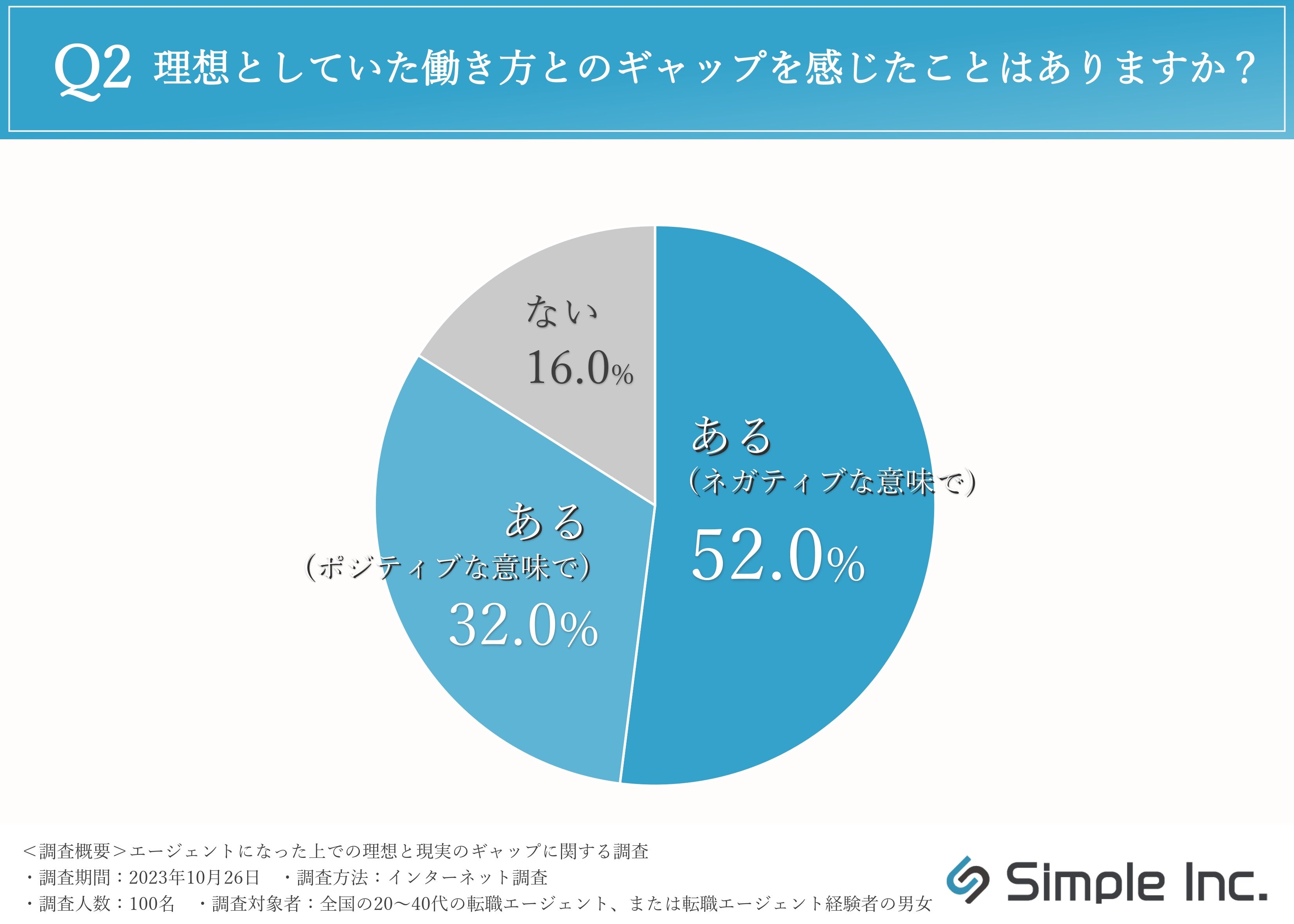 続いて、理想としていた働き方とのギャップを感じたことがあるか伺ったところ、「ある(ネガティブな意味で)(52.0%)」「ある(ポジティブな意味で)(32.0%)」「ない(16.0%)」という回答が集まりました。