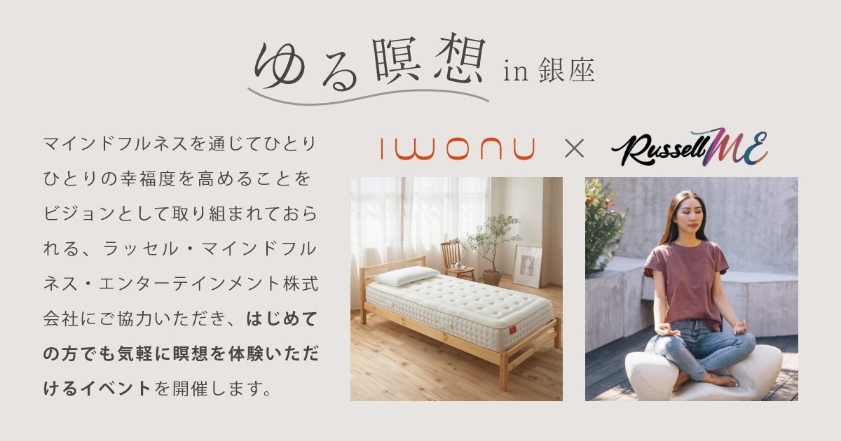 IWONU(イウォーヌ)マットレスを提供する北沢株式会社(本社:大阪府大阪市 代表取締役:北沢進志)は、東京・銀座の「The craftred」にて、はじめての方でも気軽に瞑想を体験いただける、「ゆる瞑想 in銀座」を2022年3月20日(日)に開催します。
