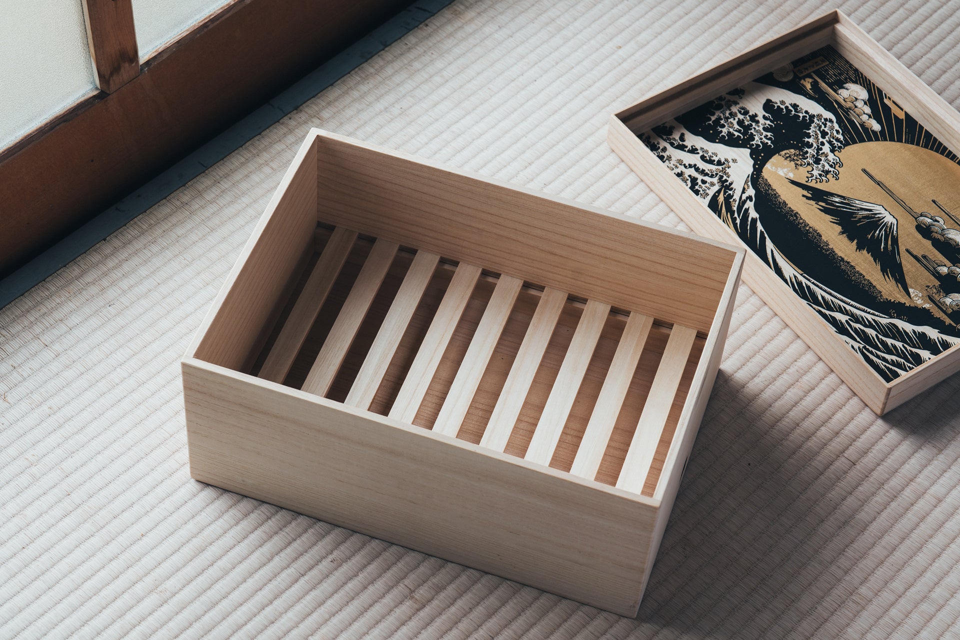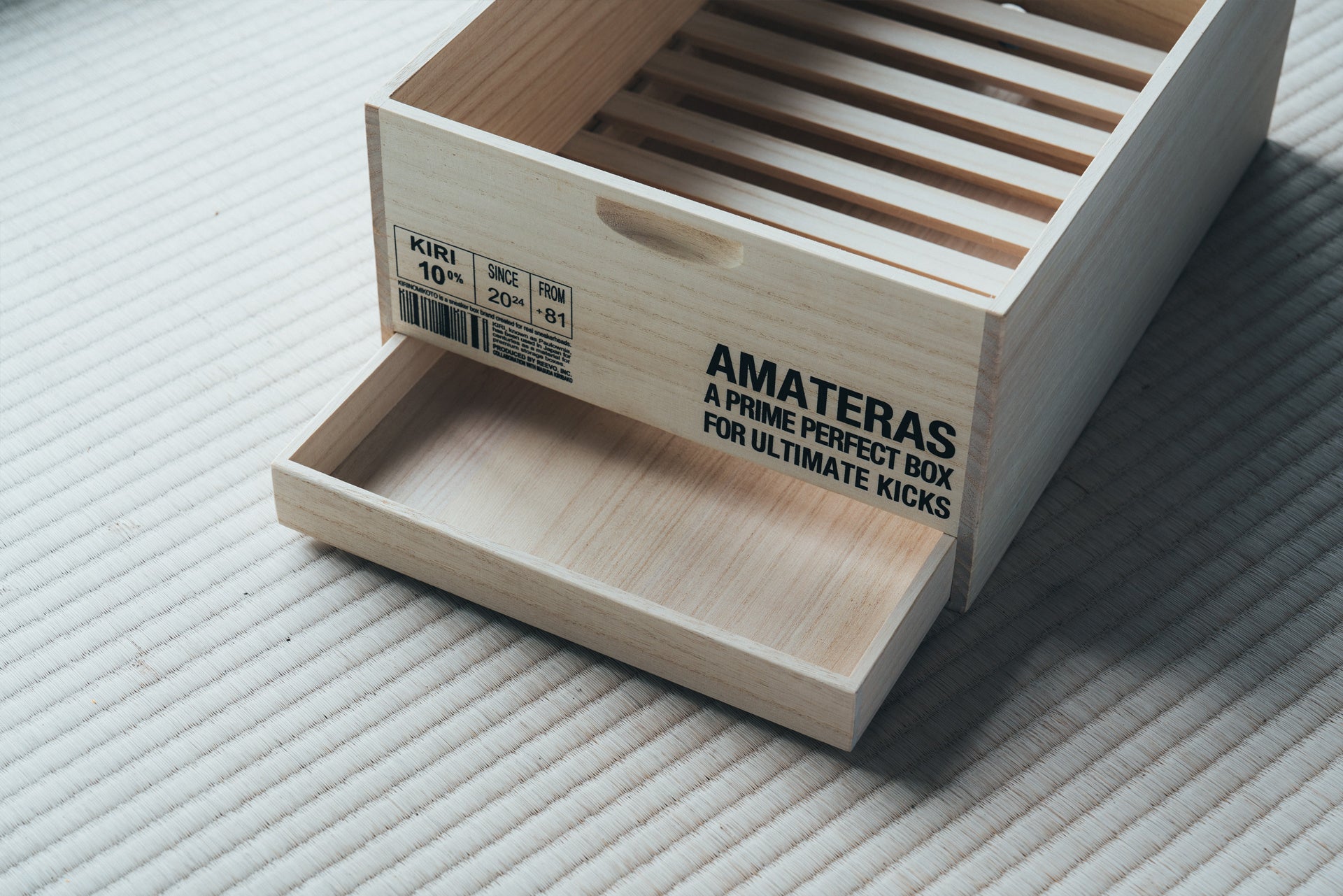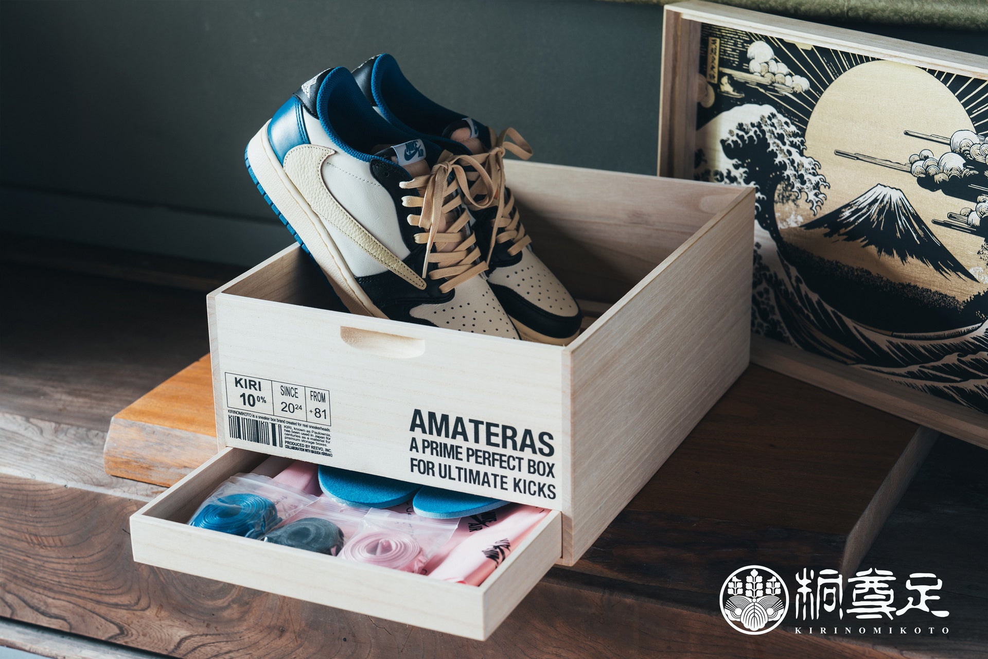 AMATERAS-アマテラス-は、スニーカーコレクターが最も価値を見出す一足を保管するために特別にデザインされたモデルです。蓋の天板には「天照至高無上ノ靴」と記され、朱印でブランド名「桐尊」が施されており、蓋裏には浮世絵をモチーフにした華やかなブラックとゴールドのイラストが描かれています。また、この桐箱は2層構造になっており、上段にスニーカーを、下段にはスニーカーの付属品を収納できる引き出しが付いています。加えて、箱側面にはオリジナル文言をレーザー刻印を入れることができ、世界にひとつだけの桐箱を創ることが可能です。