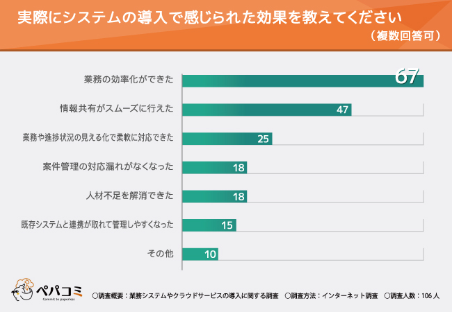 「実際にシステムの導入で感じられた効果を教えてください(複数回答可)」と質問したところ、『業務の効率化ができた』という回答者が67名ともっとも多い結果となりました。