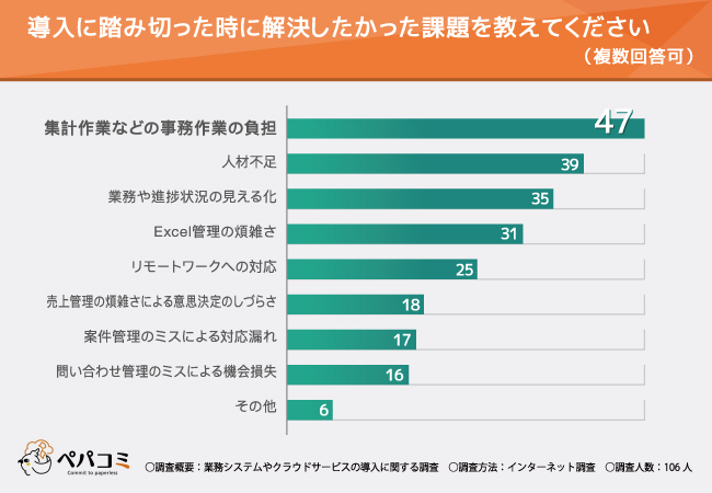 「導入に踏み切った時に解決したかった課題を教えてください(複数回答可)」と質問したところ、『集計作業などの事務作業の負担』が47人と最も多く、約44%の方が回答しています。