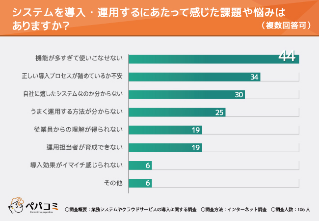 「システムを導入・運用するにあたって感じた課題や悩みはありますか?(複数回答可)」という質問に対して