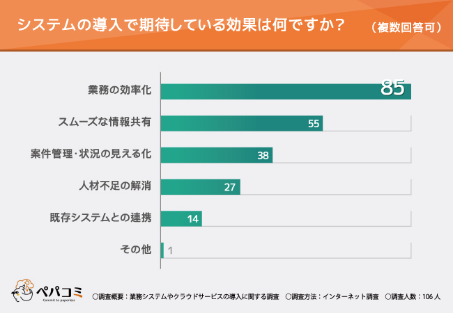 システムの導入で期待する効果は「業務の効率化」や「スムーズな情報共有」