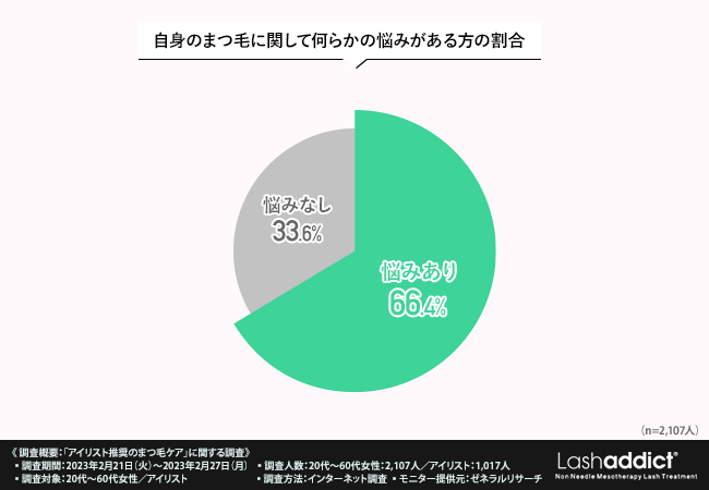 「まつ毛に関する悩みは何ですか?(複数回答可)」と質問したところ、悩みがある方は66.4%、ない方は33.6%という結果となりました。