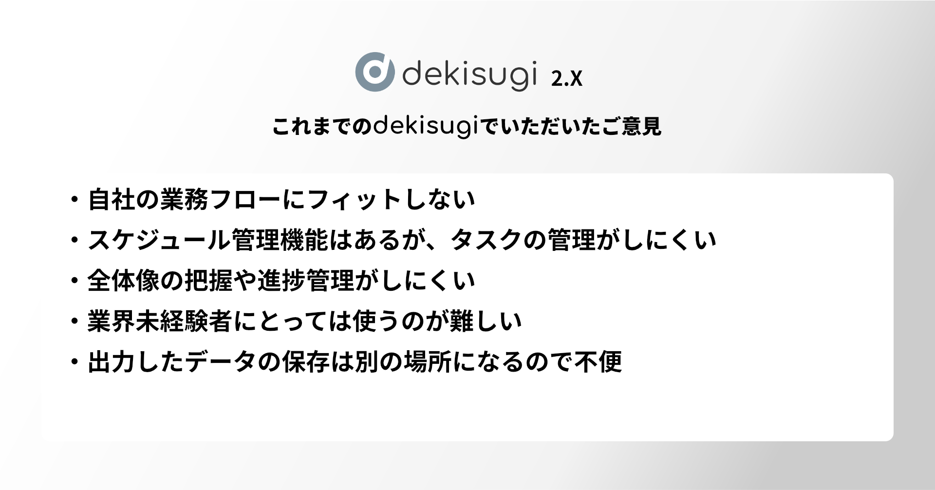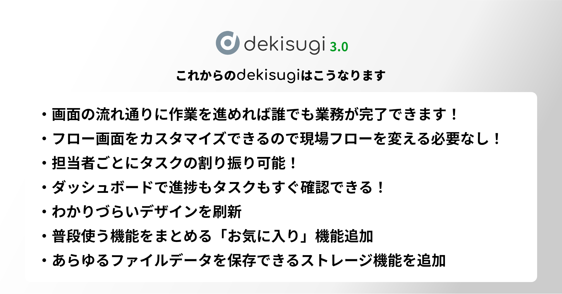 この度のリリースでは、多数いただいているご意見をもとに、従来のdekisugiでできることをそのままに、できるだけ多くのご利用者様に更なる効率化を実感いただけるよう機能群を検討し、デザインの刷新(UI/UX改善)や機能を追加してバージョンアップいたしました!
