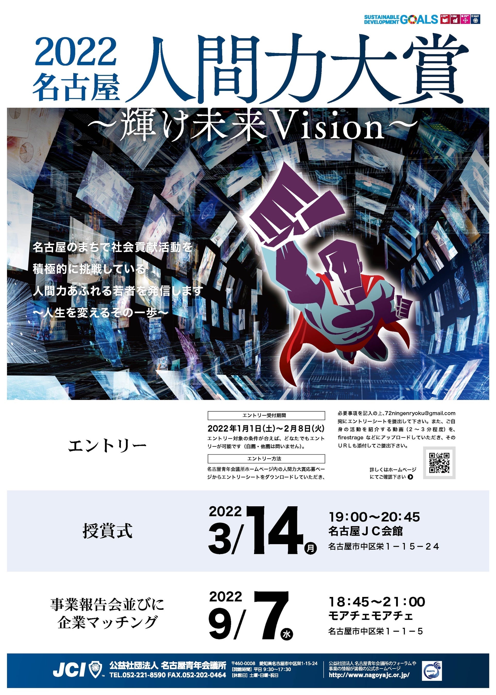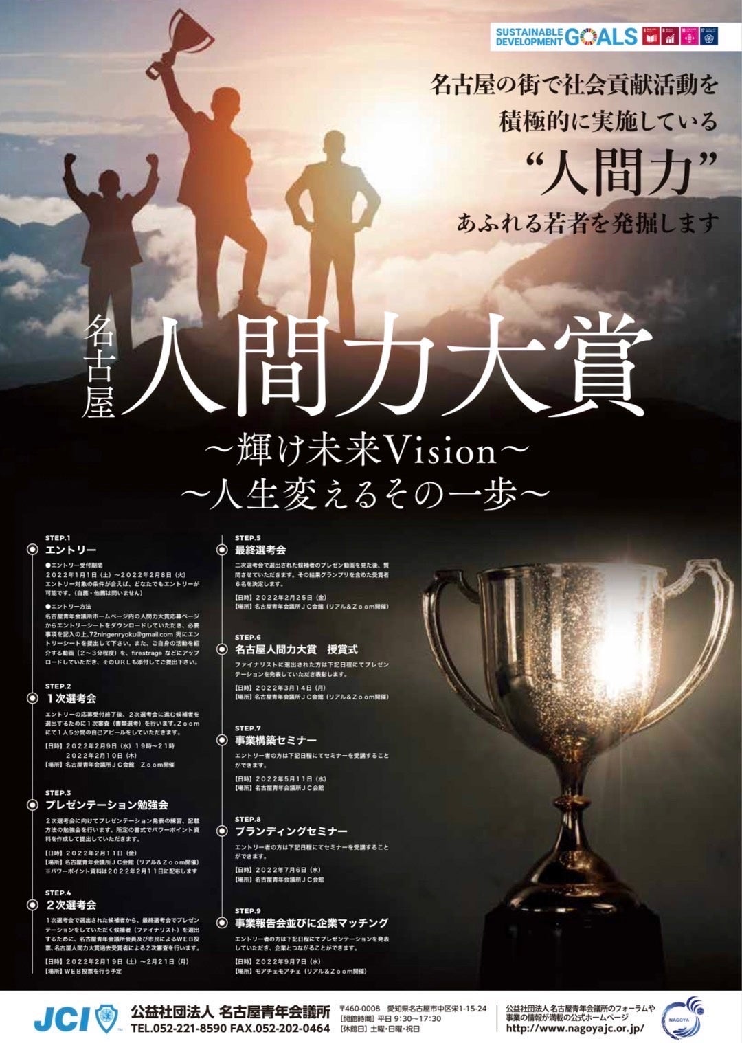 名古屋青年会議所(本社:名古屋市中区 代表:高橋雅大)では、名古屋の未来を輝かせる若者たちを育成・発信していくコンテストの「名古屋人間力大賞~輝け未来Vision~」のエントリー者を《2022年1月1日(土)》から募集します。