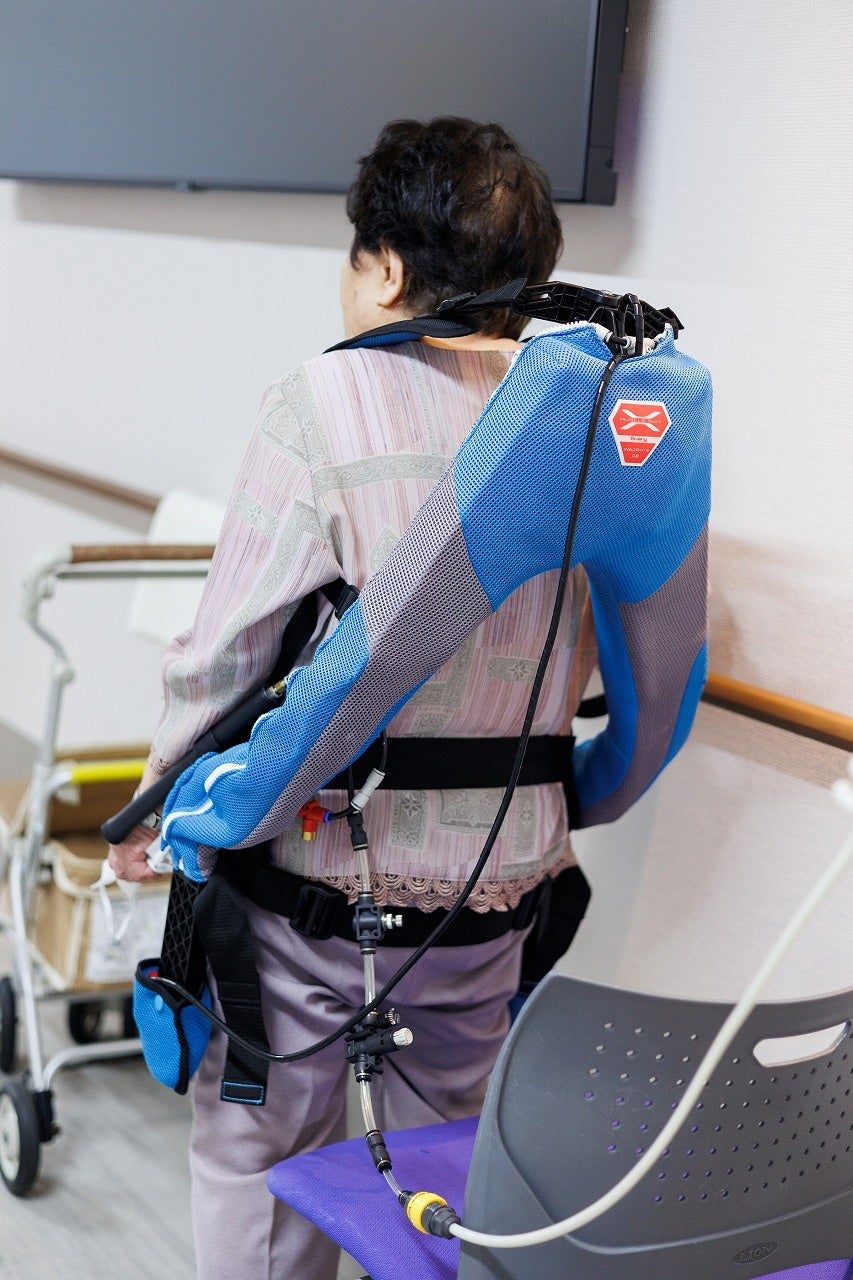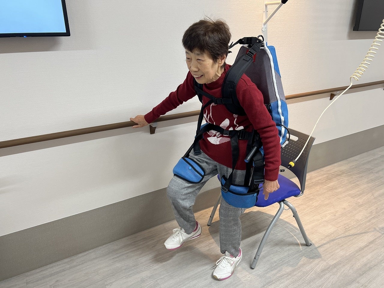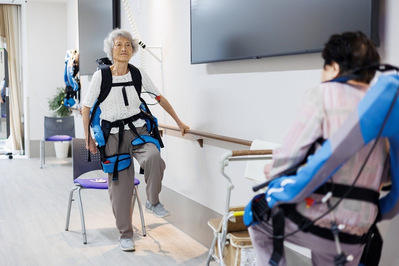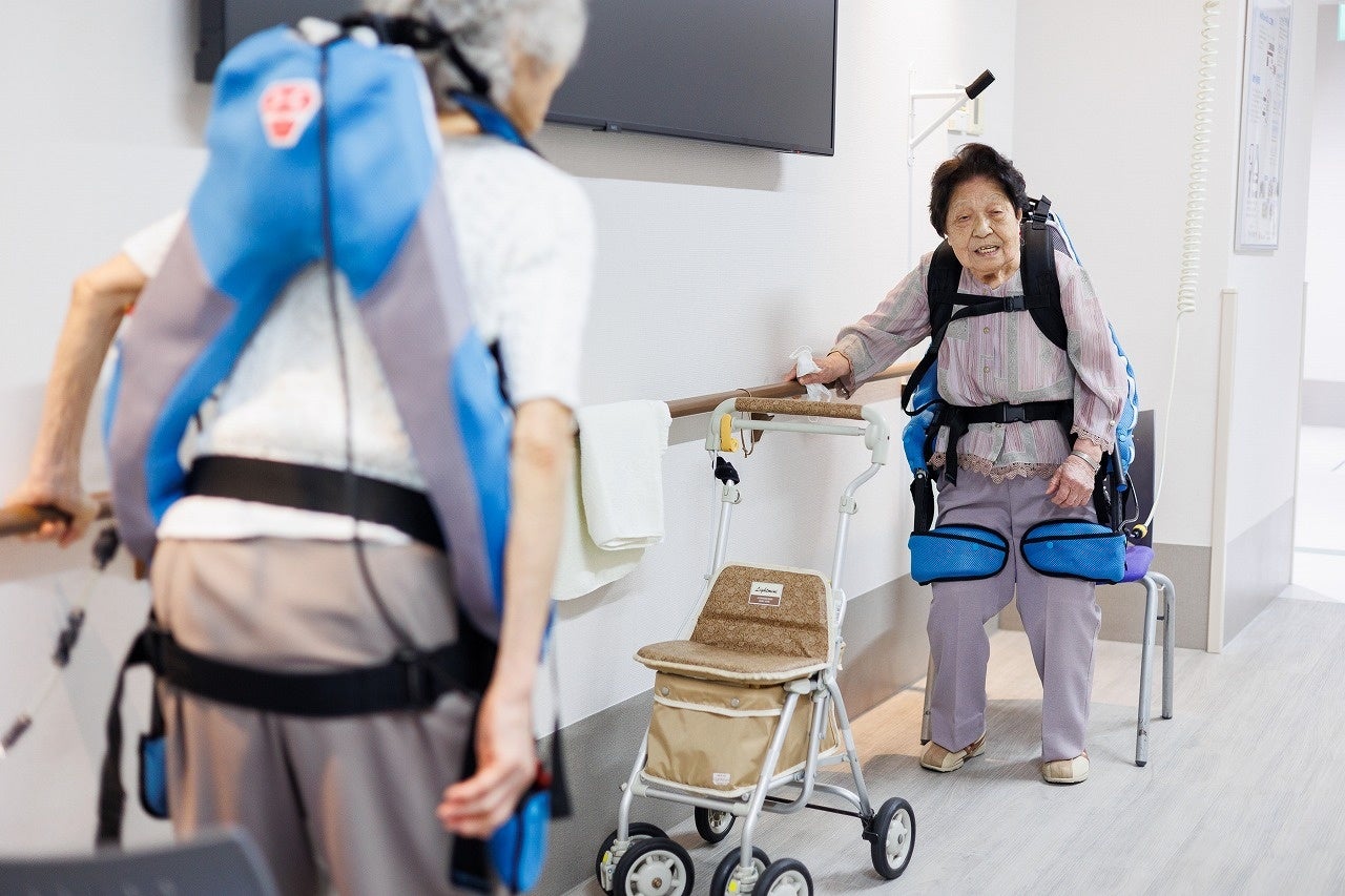 『リハビリ×マッスルスーツ』:東京理科大 小林研究室教授 小林 宏氏が開発した、「マッスルスーツ」を日本で初めて高齢者のリハビリに導入しました。年を重ねていくことで猫背になったり、腰が曲がってしまうことで歩行時のバランスが不安定な高齢者の方々が、このマッスルスーツを使用することで骨盤の位置をリセットして、美しい姿勢を取ることで歩行を安定させるという効果があります。