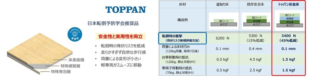 『安全床』:山梨大学 工学部教授 伊藤 安海氏とTOPPAN印刷が共同開発した、『安全床(転倒骨折リスク低減床材)』を日本で初めて介護施設に導入しました。歩きやすいように表面は硬くして、内面に柔らかい素材が入っています。転倒した時に内側の柔らかい素材が衝撃を分散して小さくするという構造になっており、転倒時の衝撃を45%低減することができます。高齢者にとっての大腿骨骨折は寝たきりの要因の一つであり、『安全床』はそのリスクを低減できる商品として日本だけでなく海外からも注目されています。