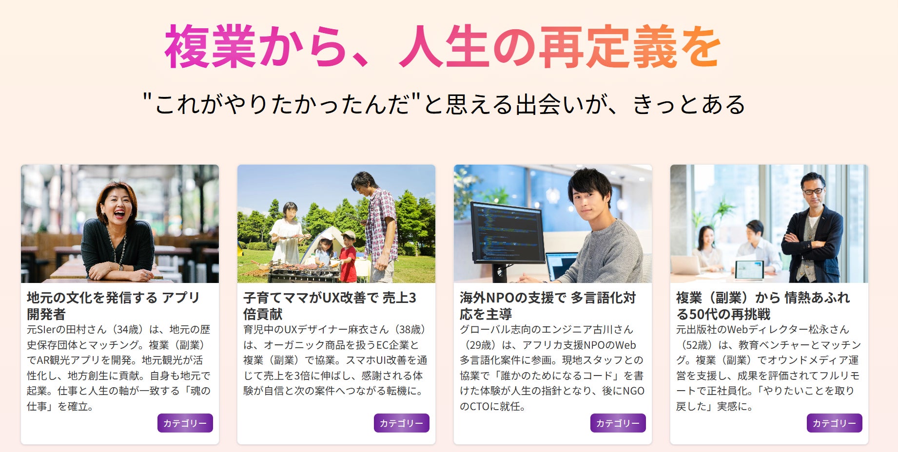 このサービスは、単なるマッチングサイトではありません。利用者一人ひとりが「魂からやりたい仕事」を見つけ、自己理解を深めながら、複業を通じて転職・キャリア転換・独立・起業といった、それぞれの道「自立」へとつながる道を切り開くことを目的としています。