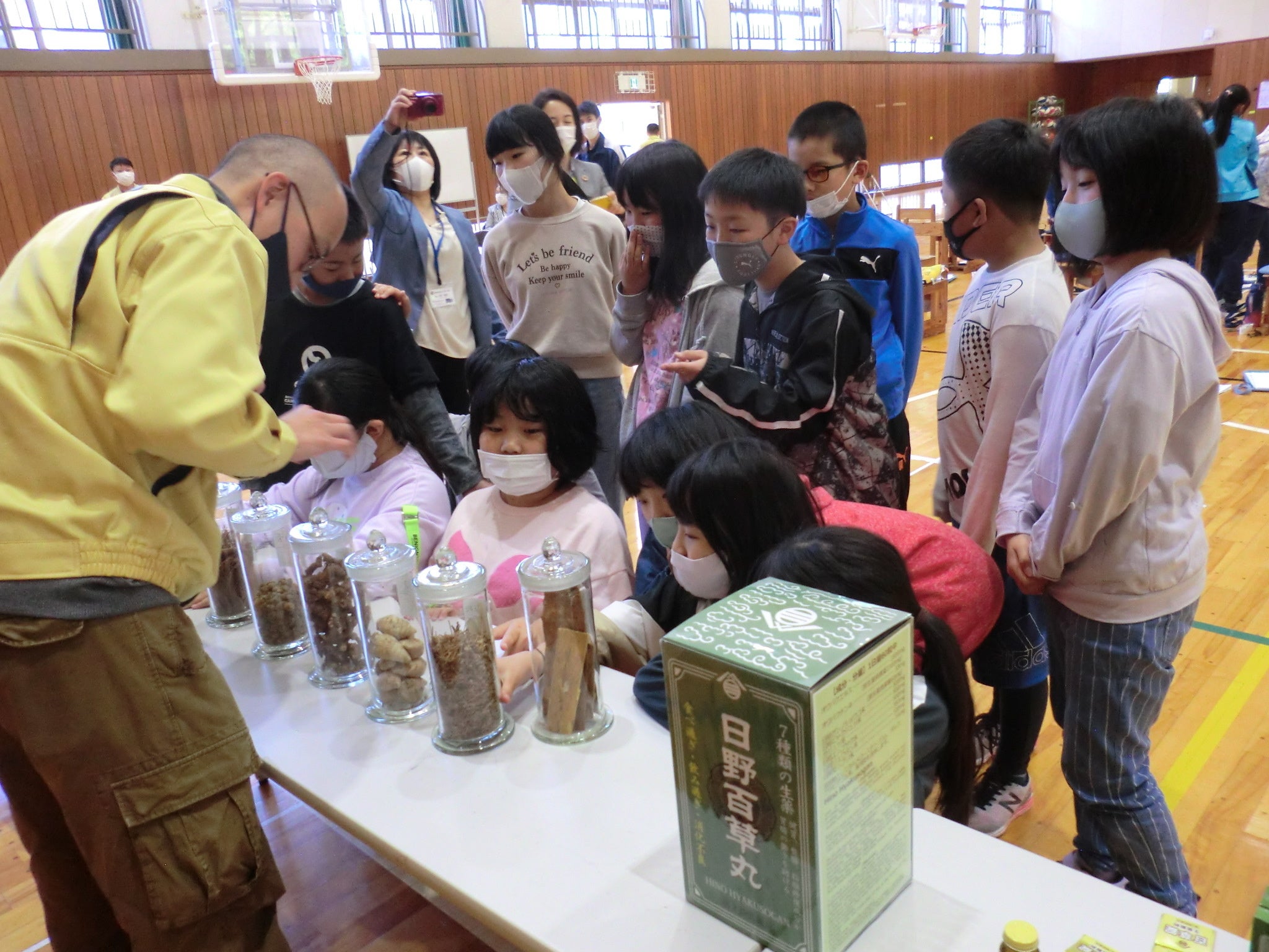 木祖村立木祖小学校の5、6 年生とキハダ植樹体験学習を行いました。「未来へつなぐ」をテーマとし、36 名の子ども達と百草・百草丸や生薬、キハダについて学習し、キハダの苗木を120 本植樹しました。未来を担う子ども達が、木曽の豊かな森、土、水の恵みや、薬草を用いる先人の知恵など、木曽の宝物を知り、未来へ継承する一助となればと考え、多くの方々のご支援・協力により今年初めて開催しました。子ども達がキハダの樹皮、実、種に興味を持ち、快晴の青空の下、懸命に穴を掘り苗木を植樹し、きらきらとした笑顔を見せてくれたことに、社員一同うれしく、良い薬づくりにかける思いを新たにする機会となりました。