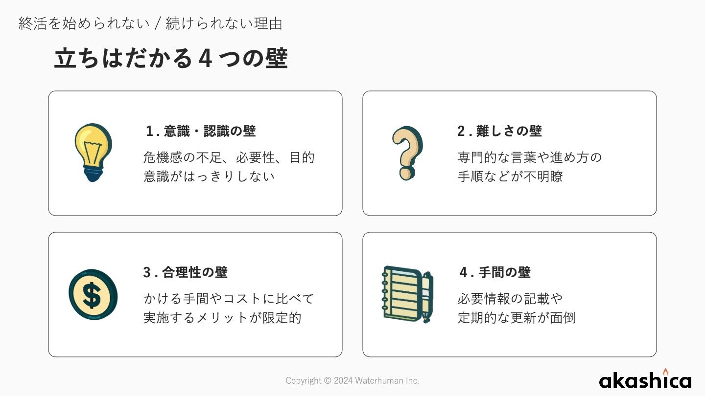 現在、終活の代名詞とも言えるエンディングノートは人々が終活の第一歩を踏み出すきっかけにはなるものの、実際に記入していく際のサポートが十分とは言えません。そのため、多くの人々が4つの壁を越えることができずにいます。このような状況は、終活を終えたいと考えている人々にとって大きな苦痛をもたらすだけでなく、死後に残される家族や行政・自治体にも多大な労力やコストを強いる事態を引き起こしています。