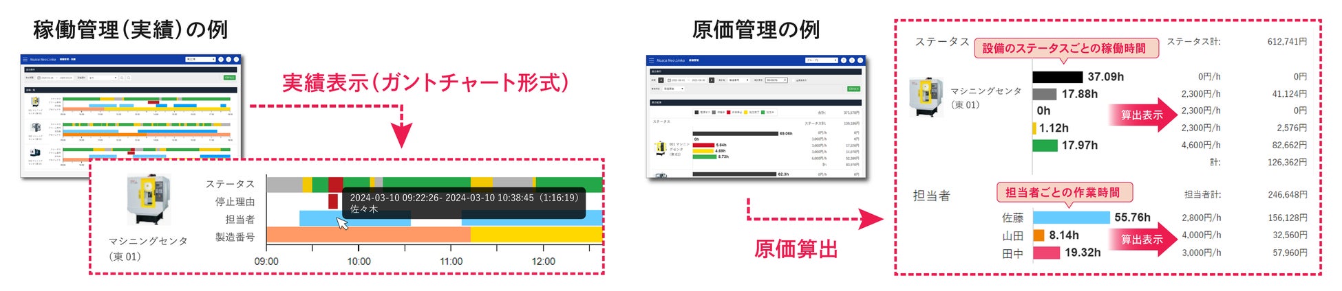 「Tracking Navi」で収集した作業者情報を「Nazca Neo Linka」へ自動連携することで、設備のステータス情報に作業者情報を紐づけて管理できるようになります。リアルタイム表示をはじめ、データを蓄積して、いつ・だれが・どの設備で・どれくらいの時間作業していたかを任意の期間で集計できます。また、「Nazca Neo Linka」は原価管理機能を搭載しており、収集した情報を使って製造番号や図面番号ごとの製造原価をタイムリーに算出可能です。