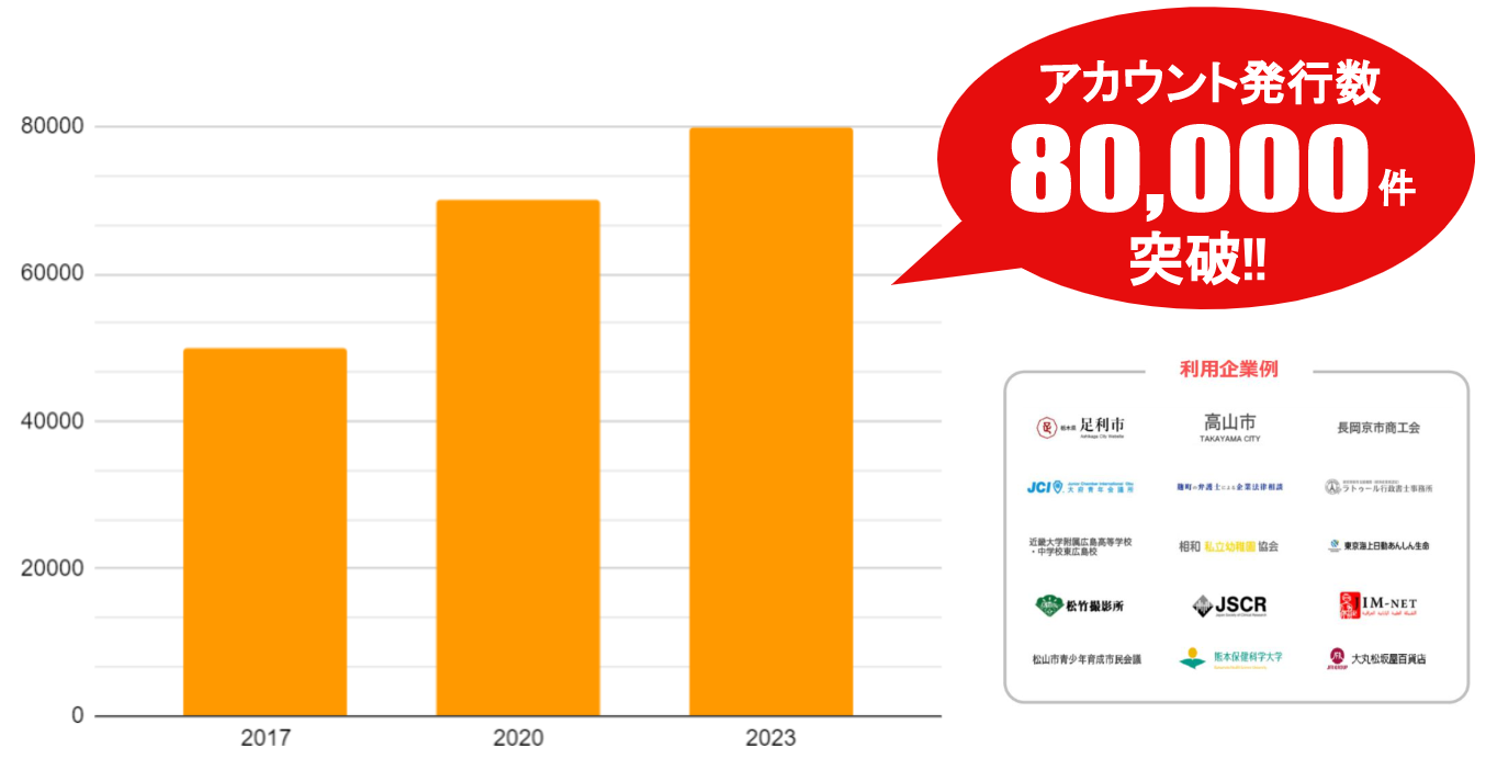 2019年には、オレンジフォームのチャットワーク連携機能がChatwork APIアプリコンテストの審査員特別賞を受賞し、2022年にはオレンジメールが日本トレンドリサーチ(株式会社NEXER)によるインターネット調査で「機能満足度 No.1」 「使いやすさ No.1」「届きやすさ No.1」の三冠を獲得しました。そして、2023年、アカウント発行数が80,000件を突破いたしました。