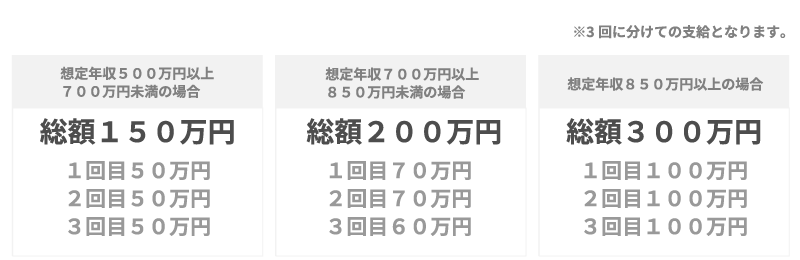 想定年収が500万円以上700万円未満の場合は、入社半年後に1回目の50万円を支給、2回目、3回目は算定期間を設け基準日に50万円がそれぞれ支払われる形式で、総額150万円を入社お祝い金として受け取ることができるキャンペーンとなります。想定年収700万円以上850万円未満の場合は総額200万円、想定年収850万円以上の場合は総額300万円を入社お祝い金として受け取ることができます。(詳細は以下の図を参照)