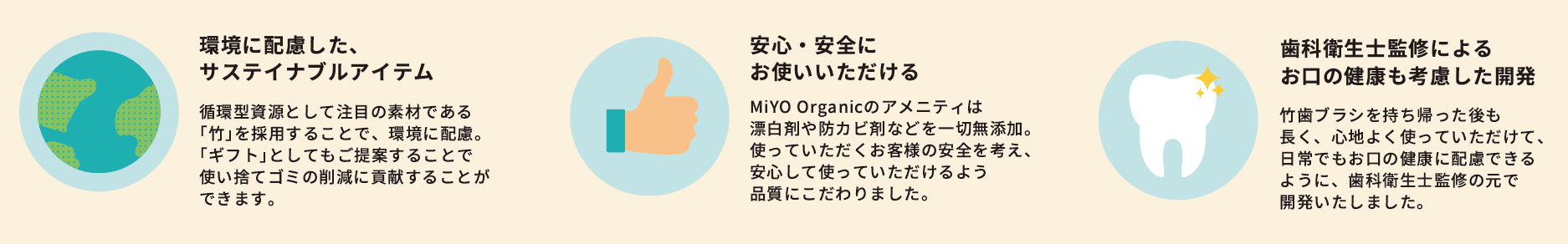「MiYO Organic(ミヨオーガニック)」は、「プラスチック資源循環促進法」に対応して、環境に優しい竹を使ったホテルアメニティを展開します。使い捨てが当たり前になっているホテルアメニティですが、宿泊客様への「ギフト」と位置付けることで、捨てずに持ち帰るという新しいアプローチをご提案します。ホテルでも、家庭でも、無理なく心地よく廃棄ゴミの量を減らす事ができます。