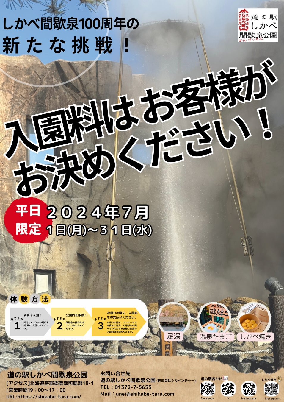 道の駅しかべ間歇泉公園を運営する株式会社シカベンチャー(北海道茅部郡鹿部町、代表取締役:阿部成史)は、しかべ間歇泉公園の入園料に新しい料金制度として「ポストプライシング」を7月1日から試験的に導入いたしました。