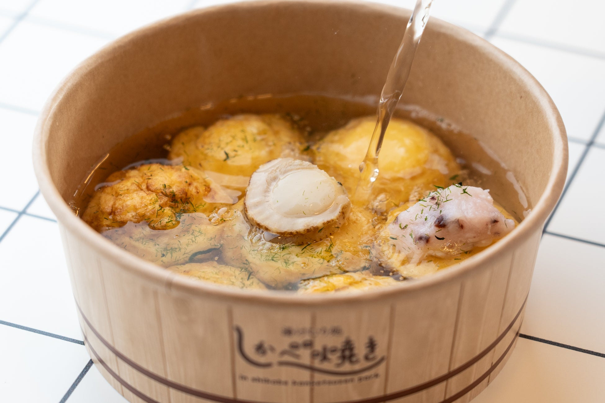 ふわふわの生地に包まれた、鹿部特産の噴火湾湾口ほたてや水だこを、最高級と称される白口浜真昆布のお出汁に浸して食べる新名物です。味変にはたらこバターや明太子バター、⻘のりバターをご用意。ひとくちで鹿部の海の恵みを味わうことができます。