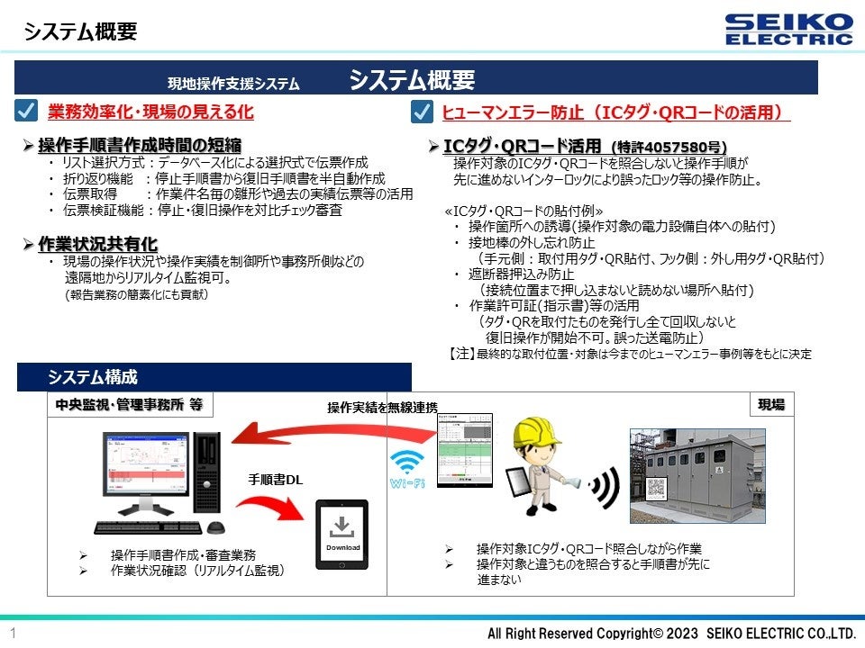 変電所構内での従来の変電設備の保全業務内での安全操作(電気的・機械的ロック等)においては、紙帳票と電話連絡を使用した作業が行われており、ヒューマンエラーによる事故リスク、電話連絡・打合せに時間を要している(効率化の妨げ)、現場での操作進捗の不透明さ(可視化の不足)といった課題がありました。これらの課題を解決するため、スマート保安(DX)製品「現地操作支援システム」が採用されました。(システム開発受託し、2022年8月より順次運用開始、2023年8月より全面運用開始)