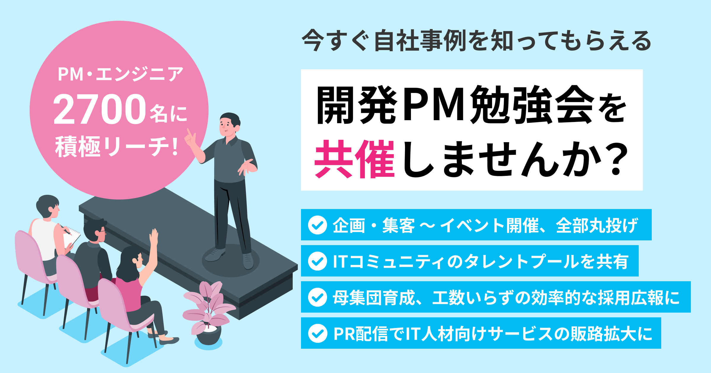 一方で、自社の開発体制に自信がなかったり、イベント実施のリソースがない企業では発信をためらってしまったり、参加者には本当に学びたい知見が届かないというミスマッチが起きていることもわかりました。そこで、自社の情報発信を強化したい企業に協賛いただくことで、開発PM勉強会が協賛企業の事例を題材にしたテーマを参加者に届くよう企画し、発信の場を運営します。