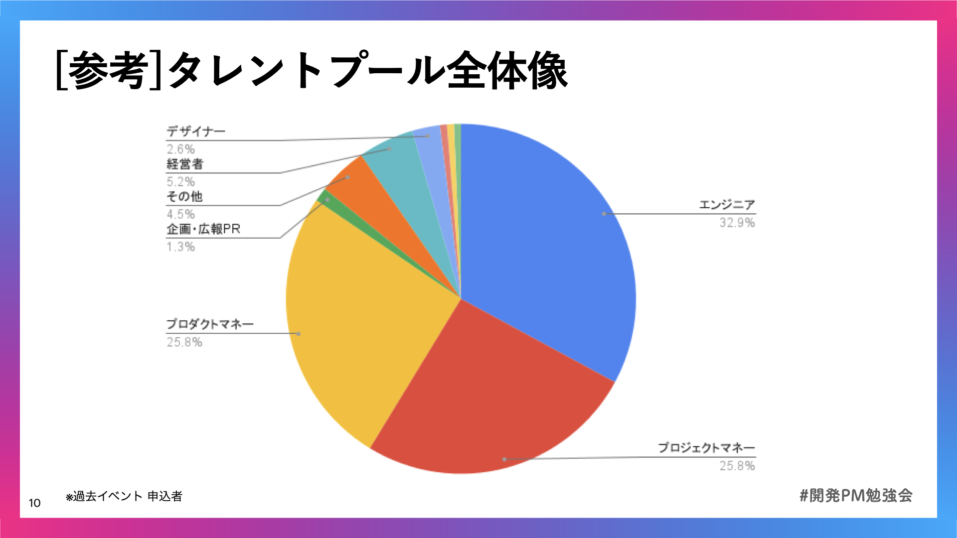 開発PM勉強会では、過去に実施したアンケートからわかっている通り、学習の機会が少ないPMのためにリアルな開発現場の事例共有を目指しています。これまでも様々な企業、フリーランスの現役PM、エンジニアが事例を発信してくれました。
