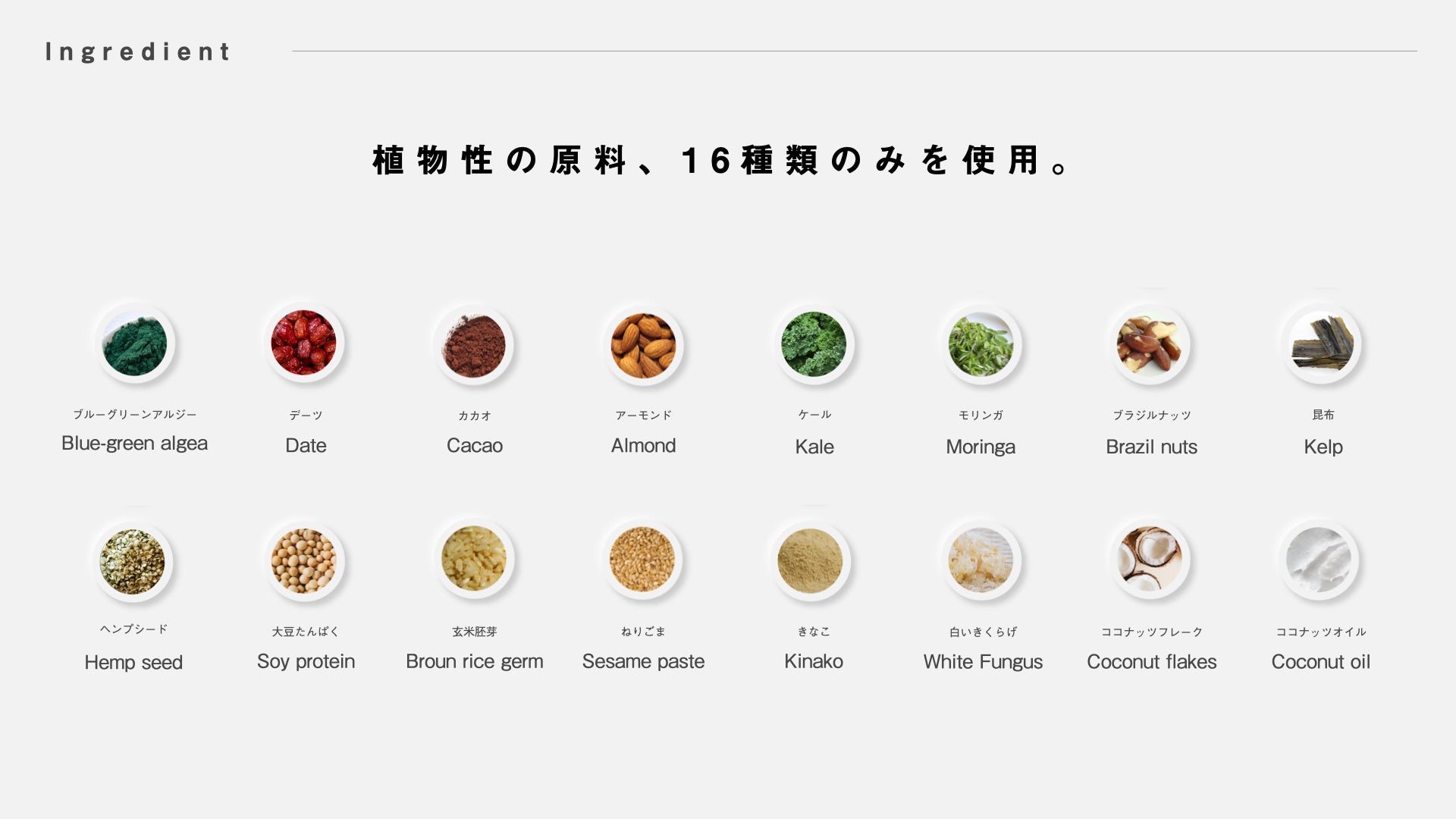 ・植物性の原料、16種類のみを使用(ヴィーガン)