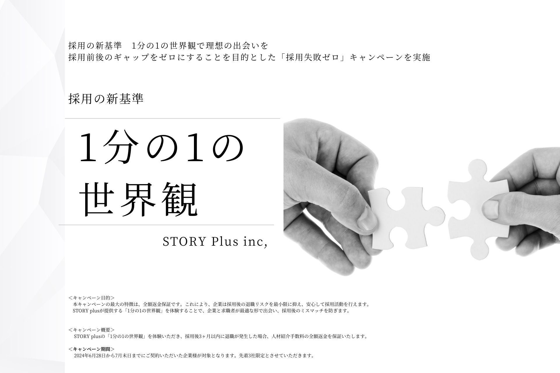本キャンペーンの最大の特徴は、全額返金保証です。これにより、企業は採用後の退職リスクを最小限に抑え、安心して採用活動を行えます。STORY plusが提供する「1分の1の世界観」を体験することで、企業と求職者が最適な形で出会い、採用後のミスマッチを防ぎます。