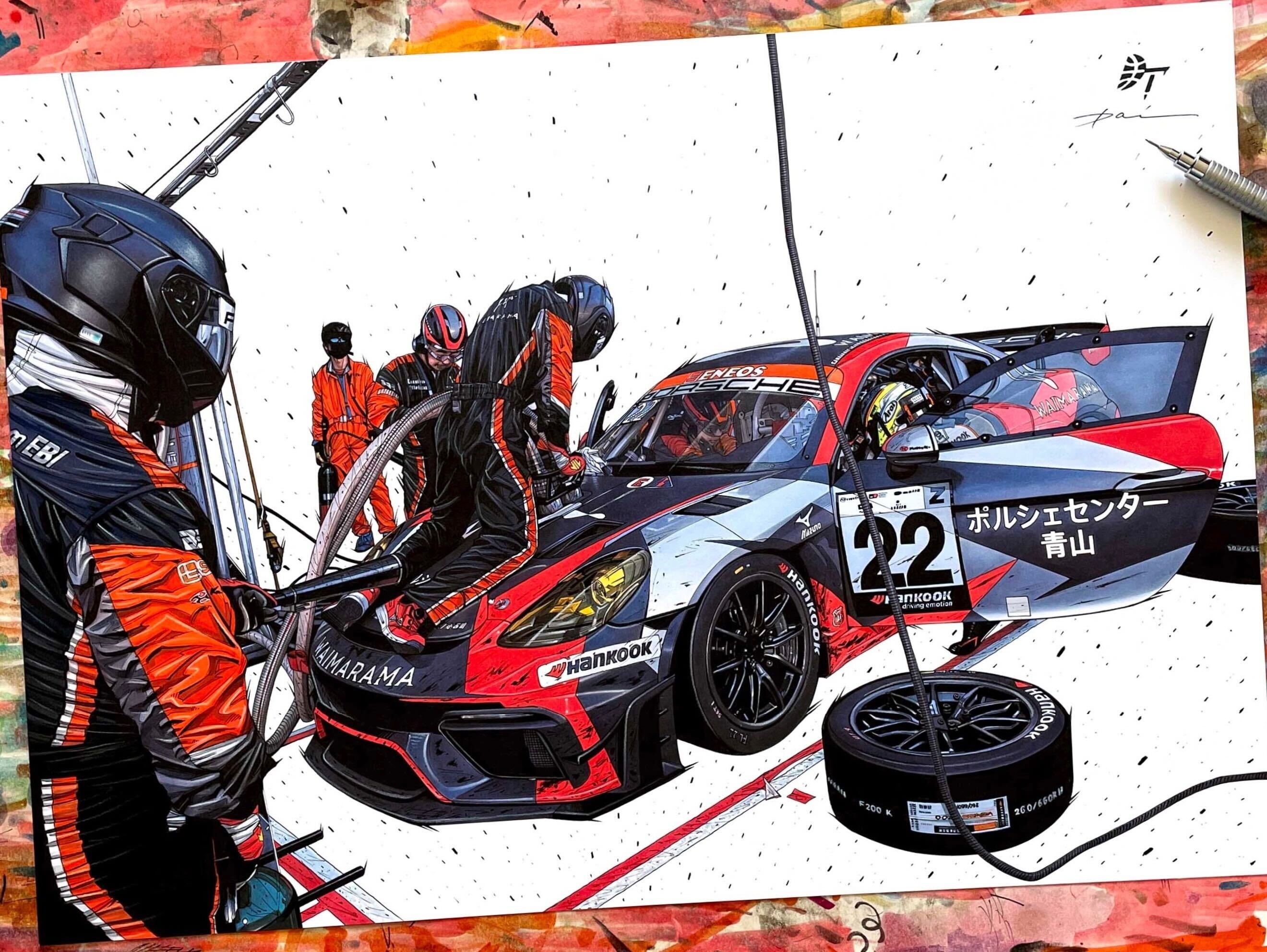 本展覧会に展示する作品の作画に際して、5月28日に富士スピードウェイで行われた『ENEOS スーパー耐久シリーズ 2023 第2戦 NAPAC 富士 SUPER TEC 24時間レース』に田村が赴き、超高速で目の前を駆け抜けるレーシングカーや1秒を争うピットの様子、24時間のレースを終えた後のそれぞれのチームが味わう感動を肌で感じる様子を実際に体験しました。世界最高峰のレースの世界観やスピード感をイラスト世界王者である田村が最も得意とする躍動感あるタッチで描くことにより、エンジンの鼓動が伝わってくるようなレーシングカーの質感や、レースに関わる人々の真剣な姿をまるでレース会場で見ているかのように再現しています。本展覧会への田村の思いや作品を描く過程でのこだわりなど、ドキュメンタリー形式の動画でまとめておりますので是非ご覧ください。