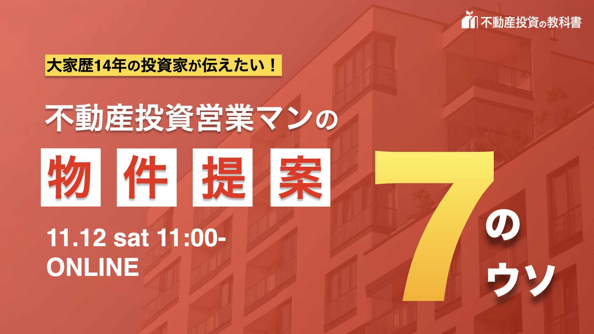 不動産投資の教科書(本社:東京都港区、代表取締役:山本 尚宏)は、2022年11月12日(土)11時に「大家歴14年の投資家が伝えたい!不動産投資営業マンの物件提案7のウソ」セミナーを開催いたします。