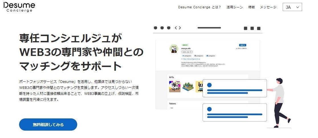 「Desume Concirge」(https://www.concierge.desume.jp/)は、WEB3特化の専門家や人材採用支援のコンシェルジュサービスです。