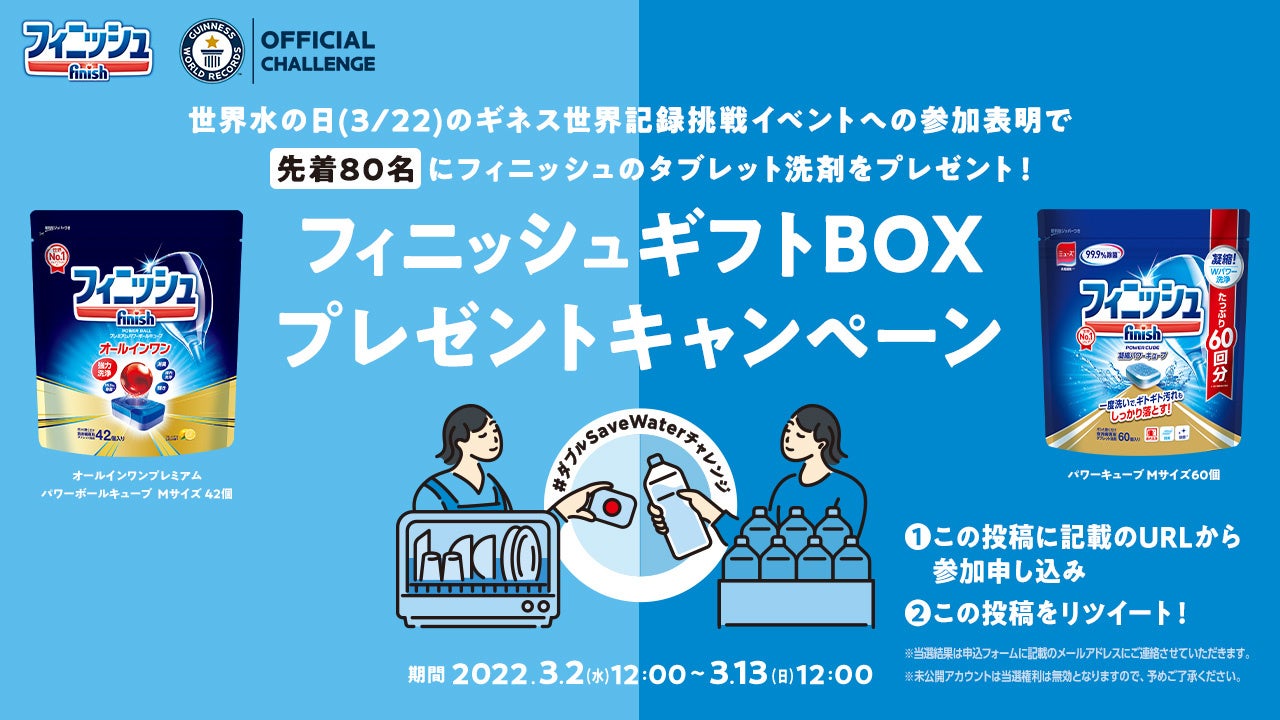 本イベントへご参加いただける挑戦者を3月2日(水)~3月13日(日)まで募集。参加条件を満たす応募者先着80名様には、イベントまでに「フィニッシュギフトBOX」をプレゼントいたします。食洗機をお持ちの方は、ぜひご応募ください。