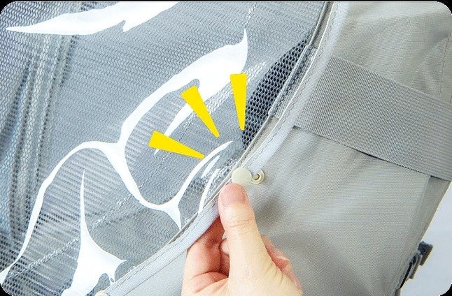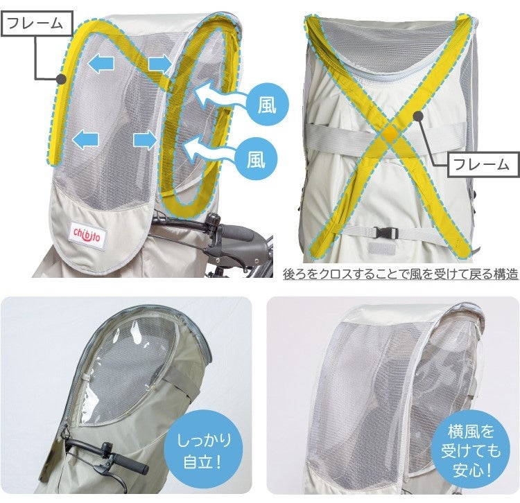 ルーフ(前窓から屋根にあたる部分)には紫外線をカットするサンシェード部と通気を確保するメッシュ部を設けています。前から入った空気は、自転車が走行することで後方のメッシュから抜けるほか、サイドの窓に設けた通気用のスナップを留めることにより左右からも抜けていきます。