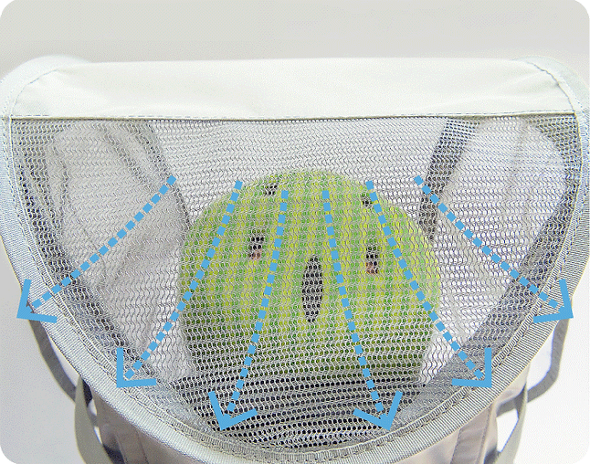 カバー本体は、外側に開こうとするバネの特質を生かした立体構造。自立するので子どもの顔をカバーがかかることなく、空間を確保します。また、横風を受けても、いったん風を「いなして戻る」のであおられにくく、立体を維持します(特許登録済み)。