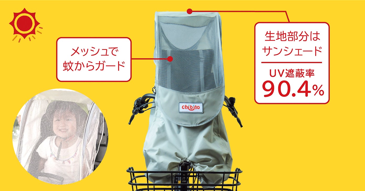 炎天下で70℃超にもなる自転車チャイルドシートの熱をやわらげ、紫外線もカット。虫よけとしても機能するサンシェードです。