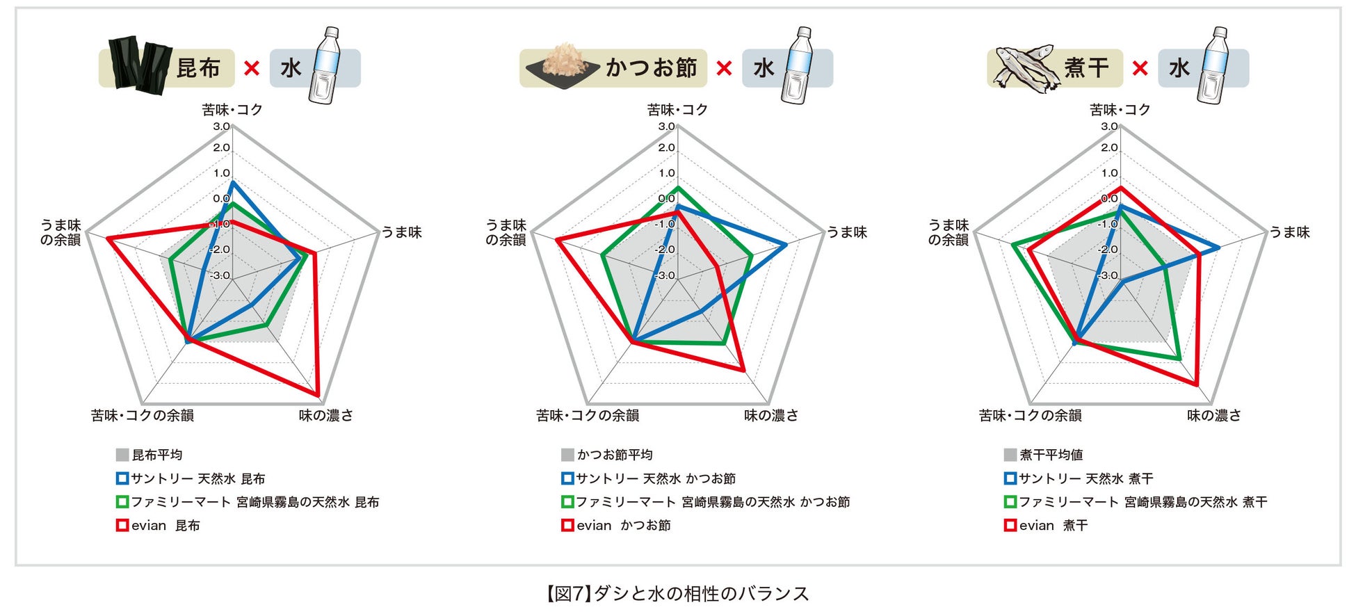 ダシの種類に関わらず、軟水は全体的に味が控えめでコクやうま味が際立つ味わい、中硬水はバランスの良い味わ い、硬水は味の濃さ、うま味の余韻が強くなり、全体的に味に膨らみがでる傾向があった。また、紅茶と同様に硬水になるにつれ、ダシの透明度は低くなった。