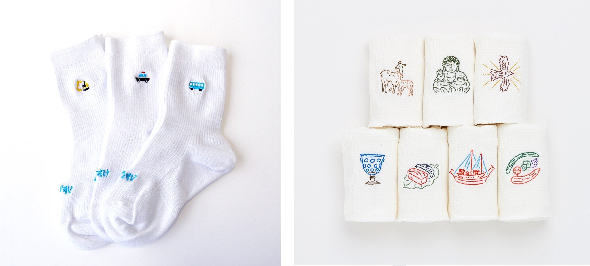 現役自衛隊隊員の声から生まれた5本指靴下「GUTS-MAN」(上)、「お名前刺繍入り靴下」(左下)と薄手の腹巻き「ならまき」(右下)