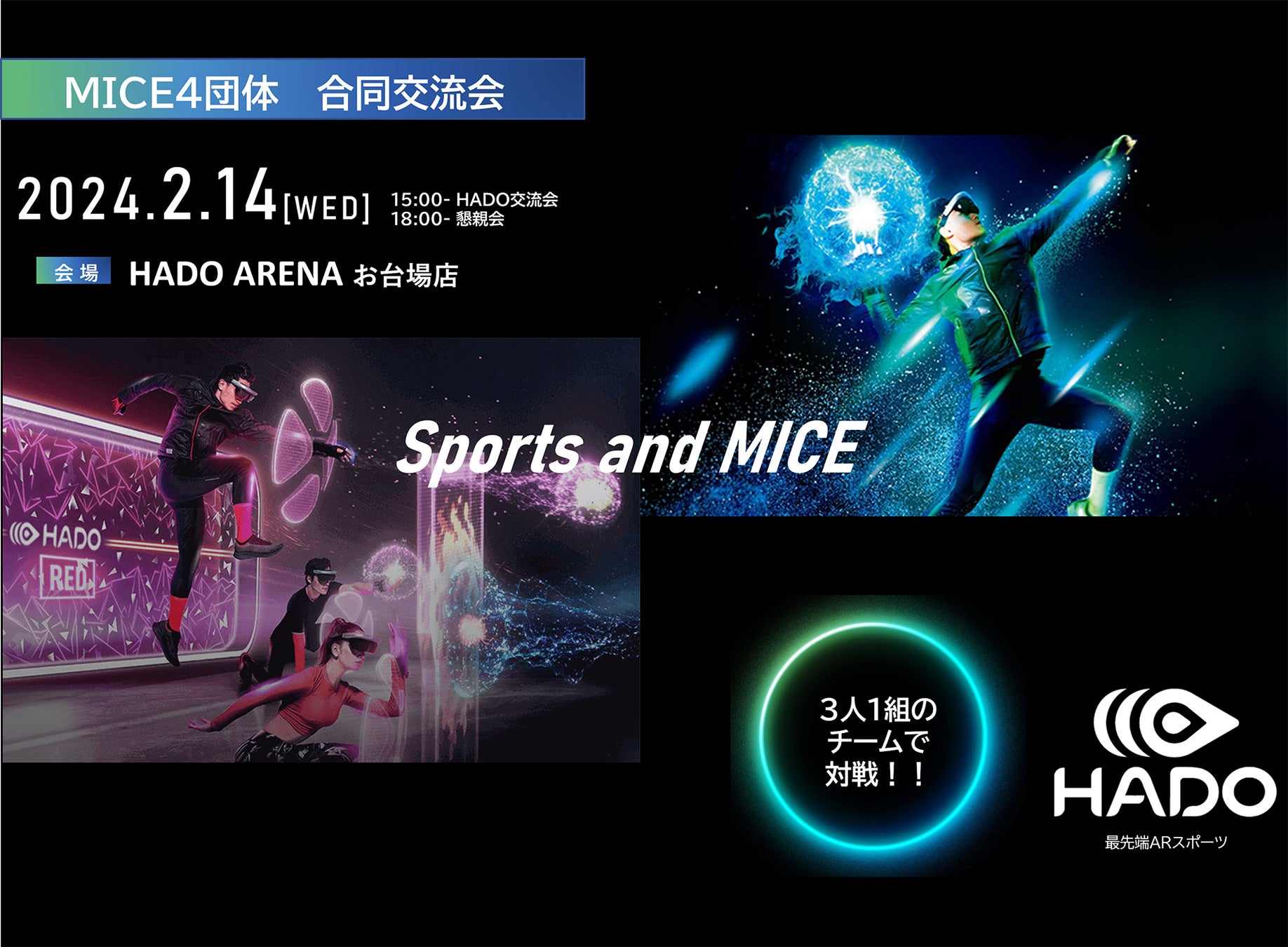 MICE産業4団体の合同交流会は今回が初。「HADO ARENA お台場店」にて、ARなどの最先端テクノロジー×スポーツ「テクノスポーツ」の大会を実施します。各団体から3人1組の30チームが出場。「スポーツ大会」を楽しみながら交流することで、ネットワーキングを促進し、MICE産業全体の連携を深め、さらなる社会への発信力強化と産業の認知度向上を目指します。