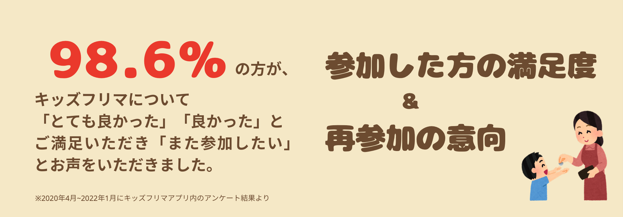 キッズフリマは、全国の小学校でのチラシ配布を通じて集客をしているため、多くの場合、お子さまが学校で配られたチラシをみて「参加してみたい」と親御さまに言われるところから始まります。その後、親御さまからも「教育に良さそうだから参加させてみよう」と参加のご判断をいただくケースが非常に多く、アンケートの結果にも現れています。