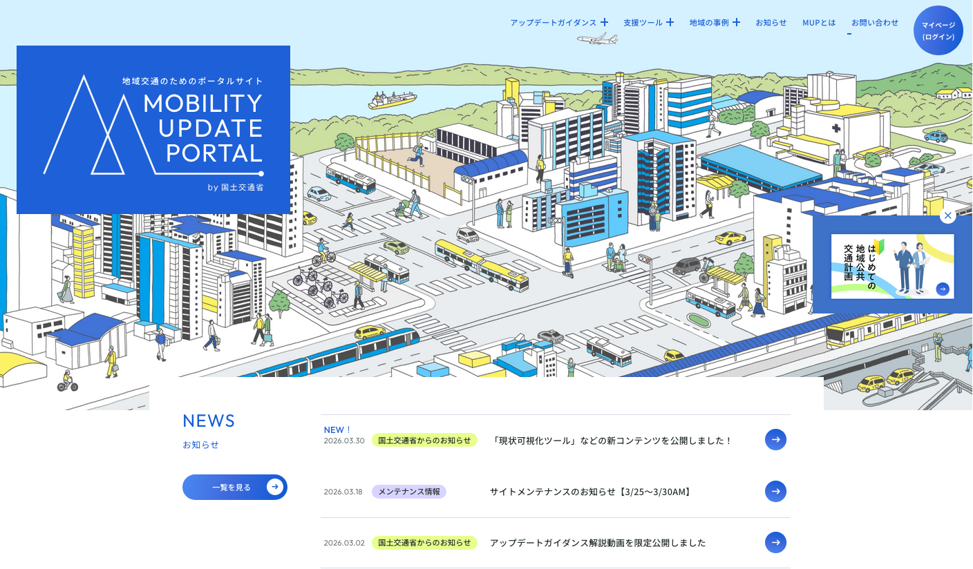 「MOBILITY UPDATE PORTAL」は、全国の地方公共団体が地域公共交通計画を円滑に策定・実行できるよう、各種ツールと情報を集約した国土交通省公式ポータルサイトです。