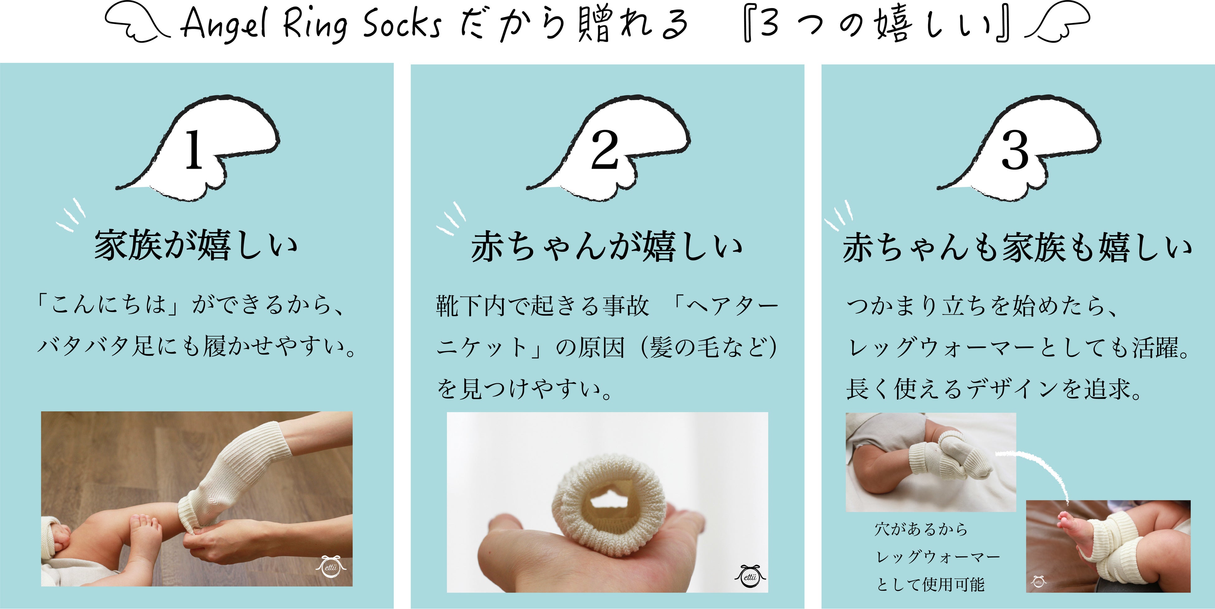 Angel Ring Socks(天使の輪の靴下)は、赤ちゃんに起こる事故「ヘアターニケット」を気付きやすくするために開発された、「あな」のあるベビー靴下です。