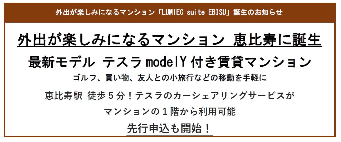 外出が楽しみになる”テスラ付き賃貸マンション「LUMIEC suite EBISU」が誕生しました。