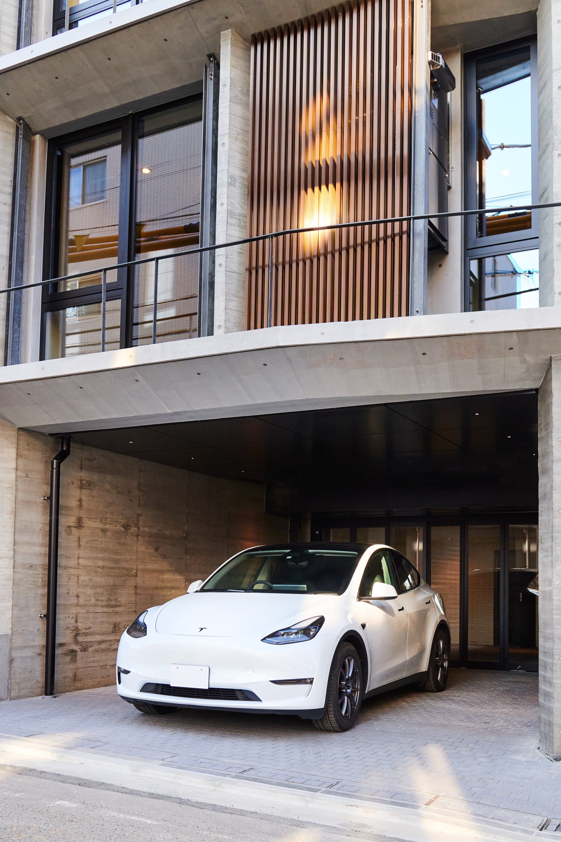 居住者専用のカーシェアリングサービスがついており、住居者であれば、誰でもマンションの1F専用スペースから、テスラの人気車種「Tesla Model Y」のレンタルが可能です。