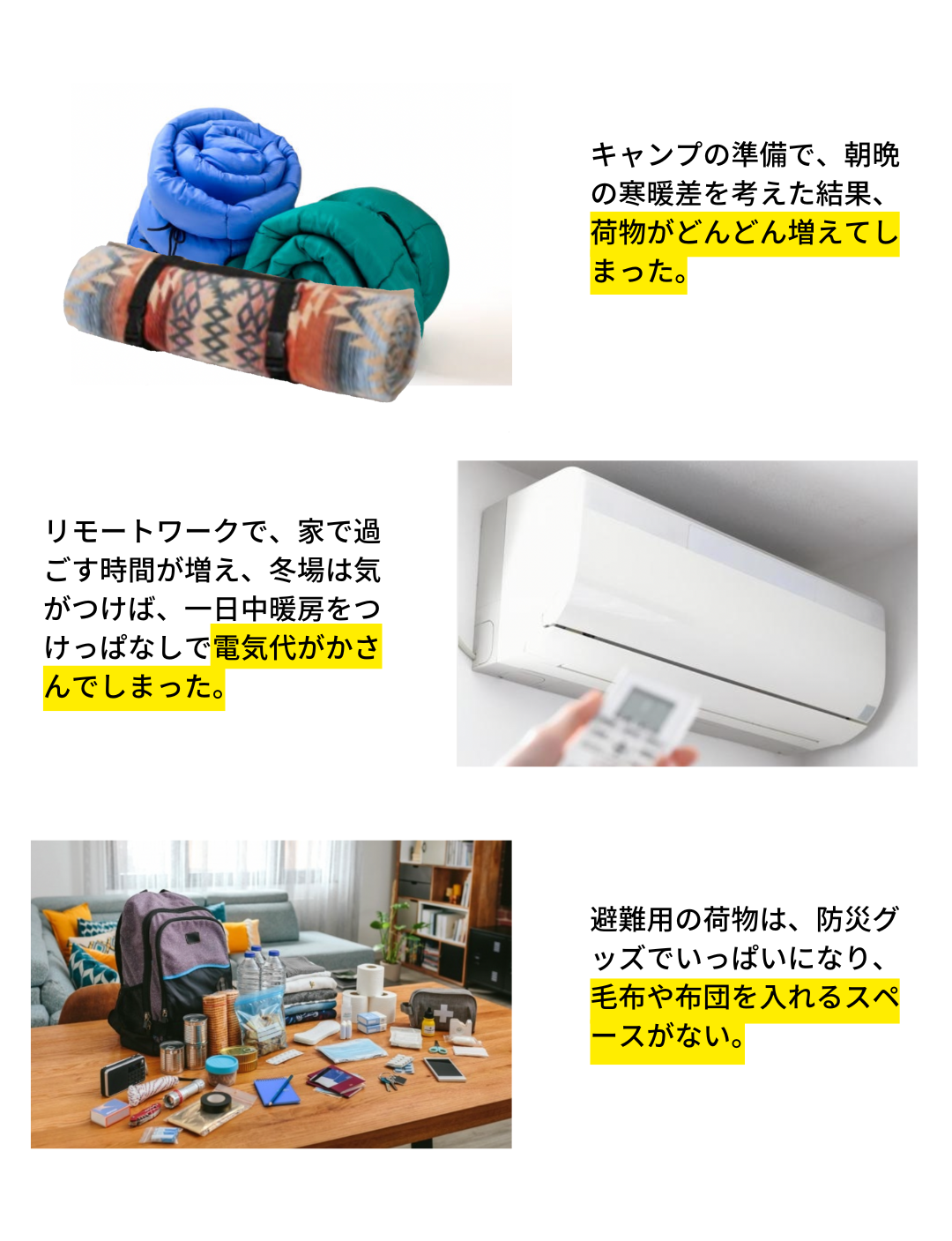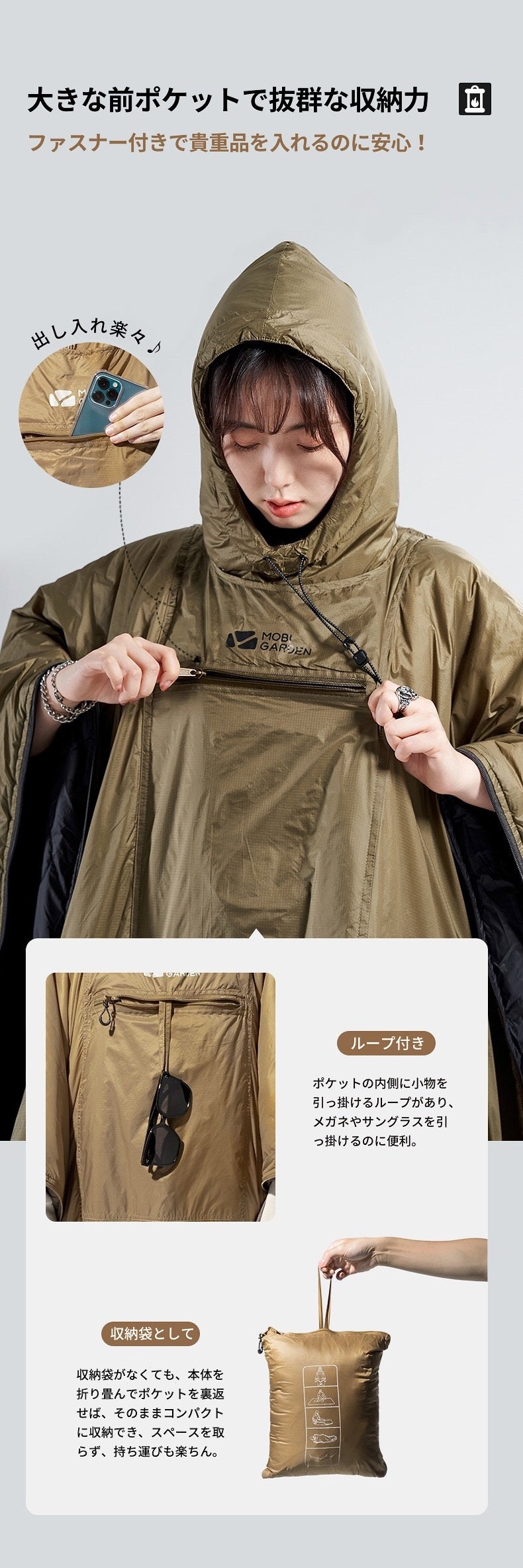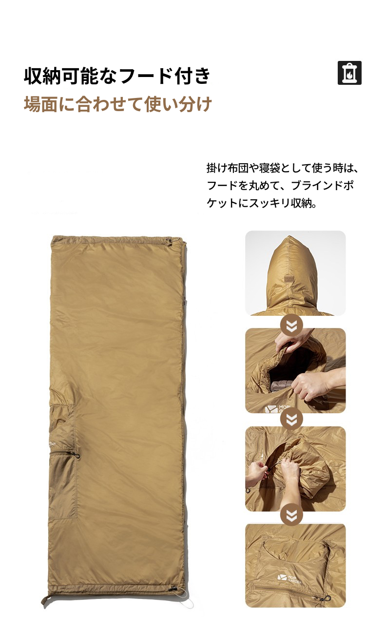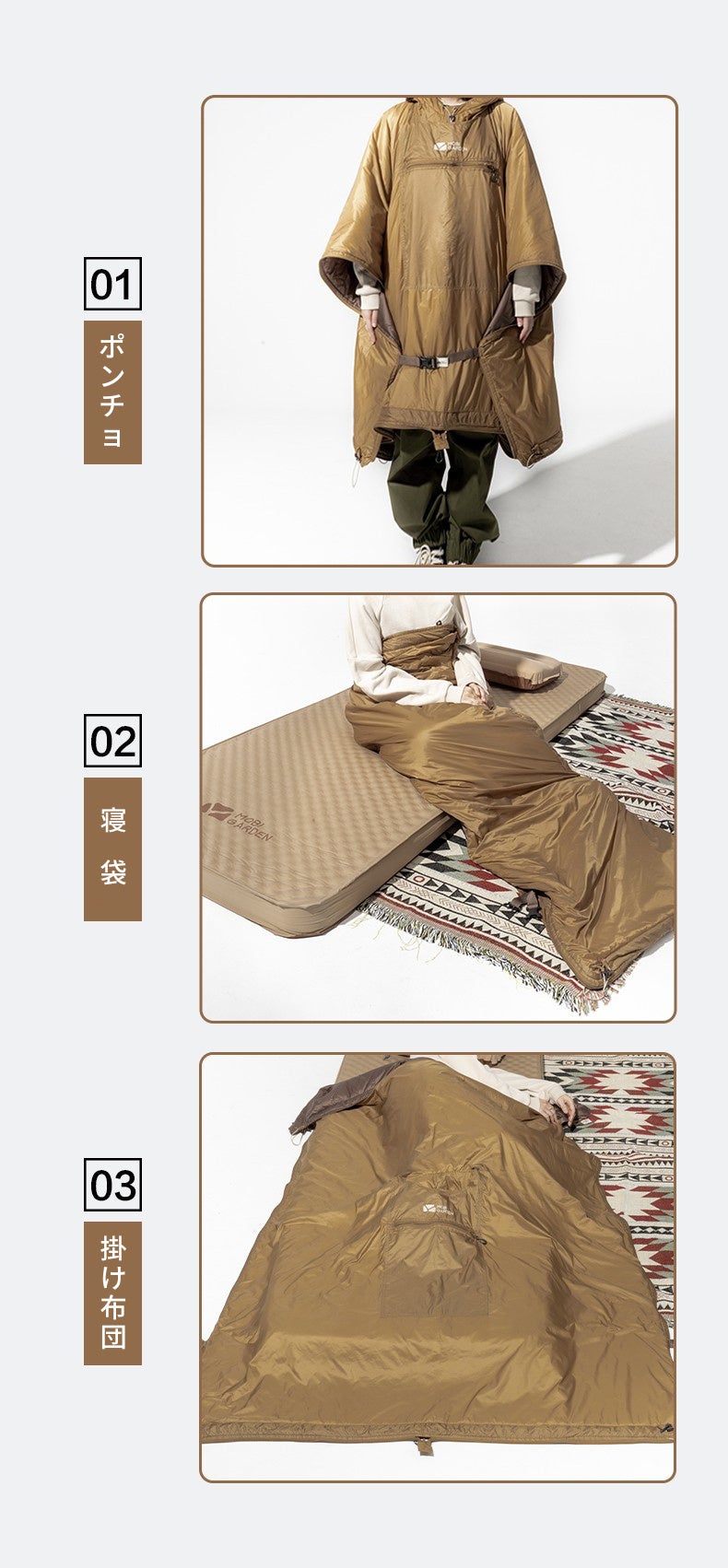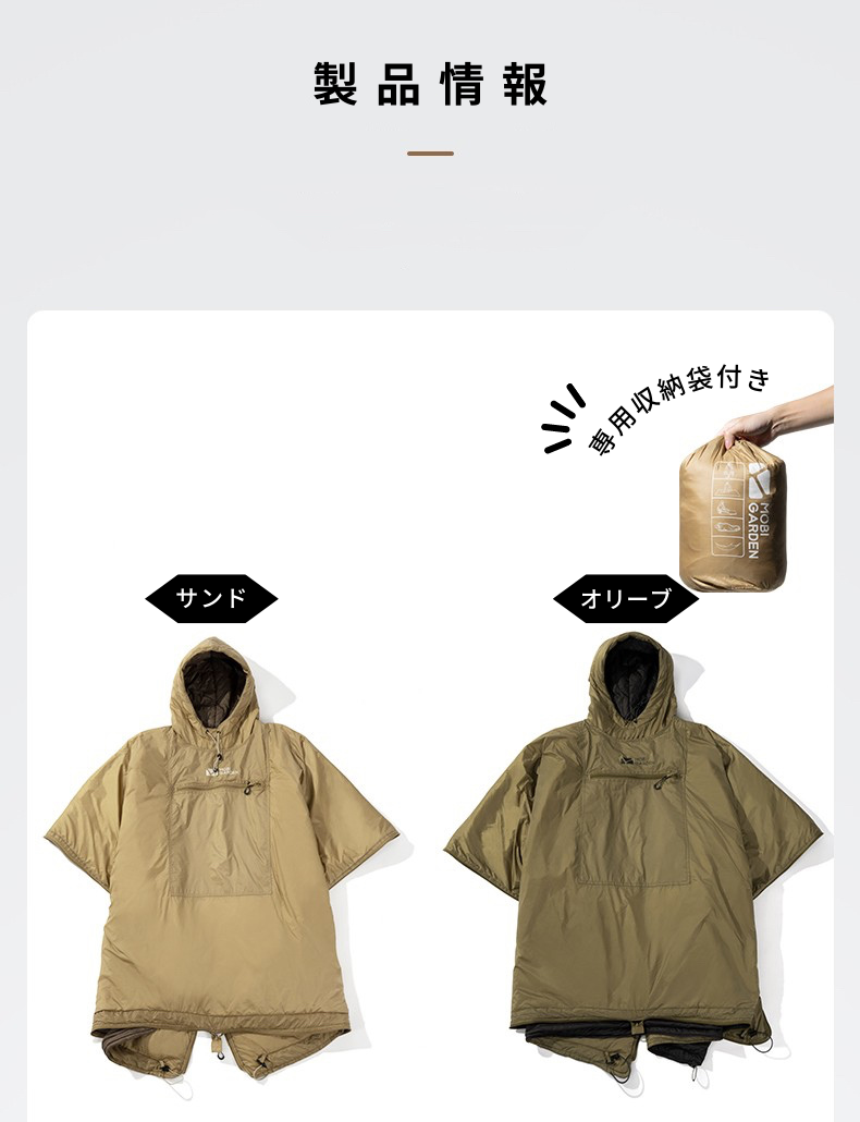 3種の使い方を場面に合わせて自在に変化:ポンチョ、寝袋、掛け布団