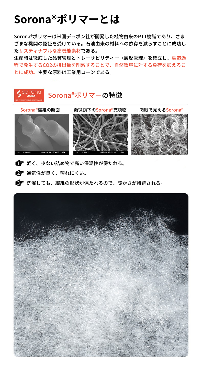 米デュポン社開発、植物由来のサスティナブル素材SORONA®︎を中綿として使用