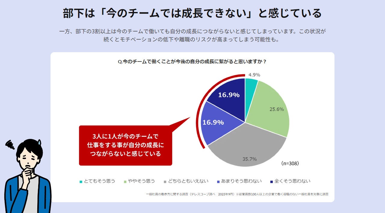 管理職と部下の皆様にアンケートを実施したところ、管理職の1番の悩みは「部下の育成」であり、一方、部下の3人に1人が「今のチームでは成長できない」と感じている結果となりました。