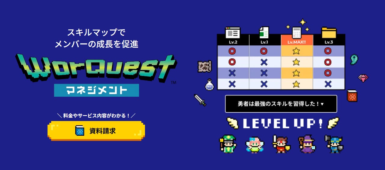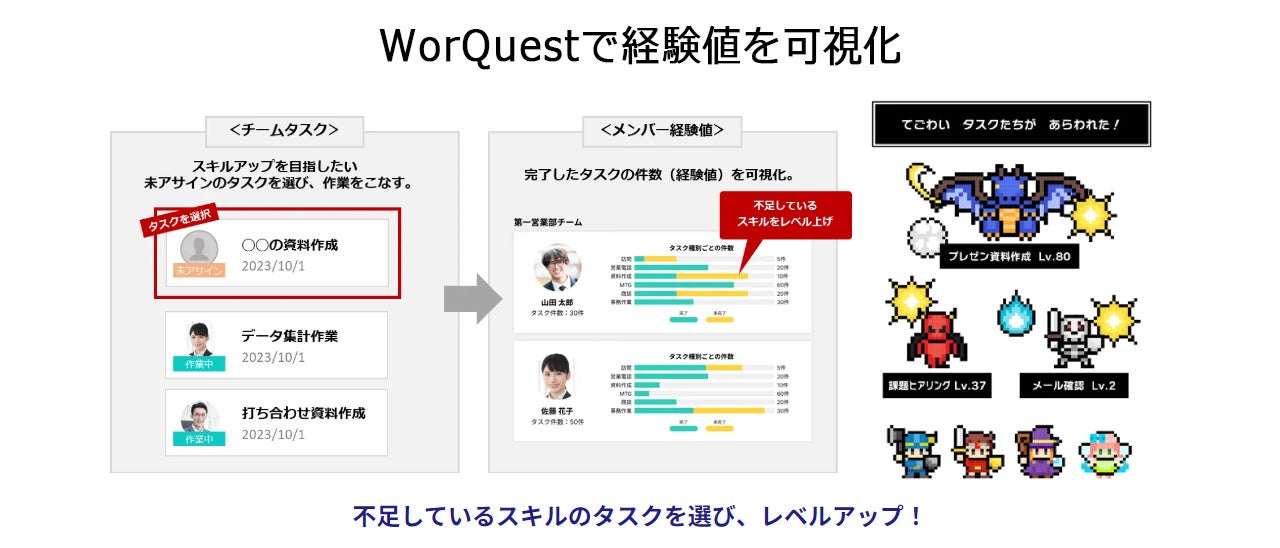 WorQuestとは、チームの仕事をRPGに置き換え、タスク(RPG上のモンスター)をこなす(倒す)事でスキルを上げるという考え方のタスク管理ツールです。チームで共通の敵を倒し、共に成長する事で仕事のやりがいや楽しさが実感できます。