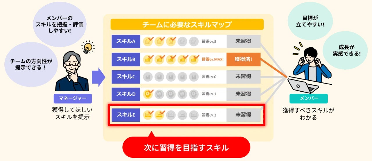 ※1:スキルマップとは、従業員が仕事をするうえで必要となる「スキル」を可視化したもの。メンバーが持っているスキルの習得度が一目でわかり、伸ばすべきスキルを把握することができる。