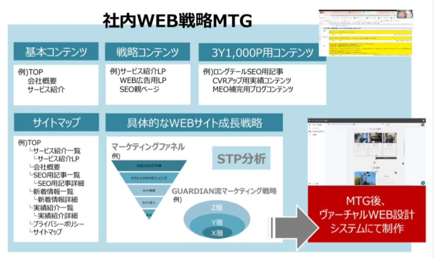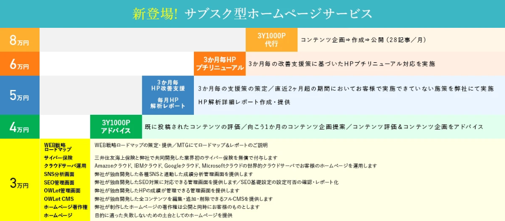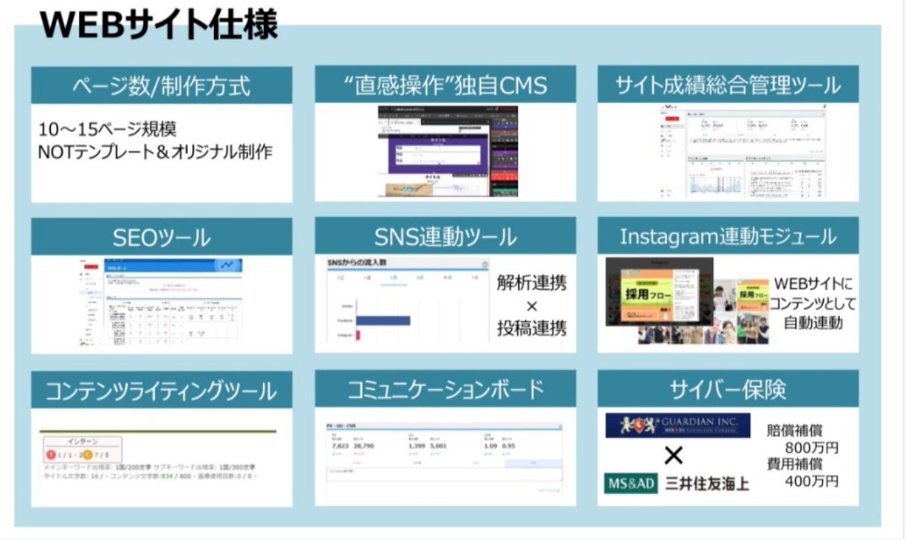 機能面においては、業界他社を圧倒するレベルの全方位機能群を装備しており、WEB戦略を実践していく上で、CMS、アクセス解析、SEO、SNS、コンテンツ作成、コミニュケーション、サイバー保険など、今後必要となるあらゆる要素を備えております。また、コンテンツの文章もガーディアンでライティングした上でご提供いたします。