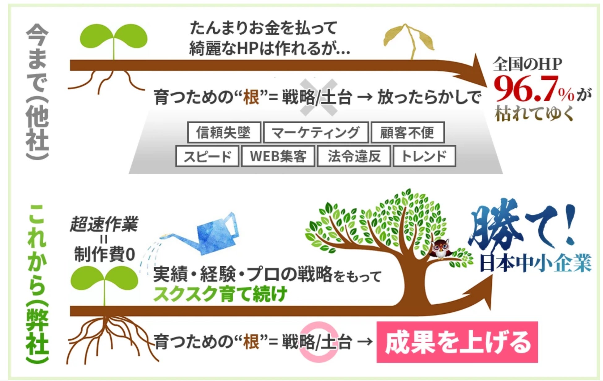 従来のホームページ制作では、ホームページ制作費/サーバ保守費にコストをかけ、高額な割に映り続けるだけで、正しい知識がなく、運営を放置してしまったサイトオーナのホームページは結果的に古くなる一方。価値のない、存在しているだけのホームページに陥ってしまっていました。