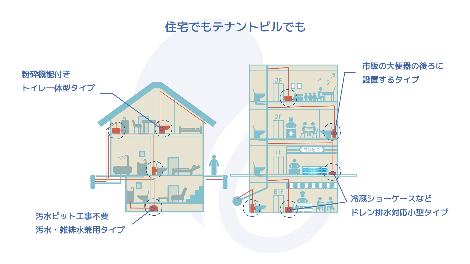 日本では、2011年に日本法人を設立して以来、個人住宅や民間企業のみならず、コンビニ、薬局、クリニック、飲食店、交通機関の駅、高速道路のSAやPA、デパートや商業施設など、皆様の身近な場所に累計4万件以上が導入されていますが、いまだに『排水圧送ポンプ』という言葉は一般には十分に浸透していません。