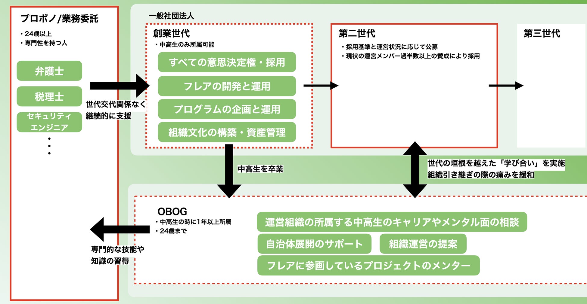 Sustainable Gameでは、ミッションの体現を目指し、従来通りの未成年である法人本体が全ての意思決定権および経営を行っていくスタイルを維持して参ります。一方で、以前から未成年だけでは担うことのできない法律や税理に関する専門家にプロボノや業務委託という形態で支えていただいておりました。今後は100年続くことを目指し、中高生を卒業した大学生とも適切に役割を分担を行いつつ、つながりを維持していくことで、中高生時代にSustainable Gameを経験したメンバーが大人になり、それぞれの道で専門的な知識を身につけた際にプロボノとして、あるいは社会問題を解決したいと志す未成年を支えられる存在となることを目指して参ります。